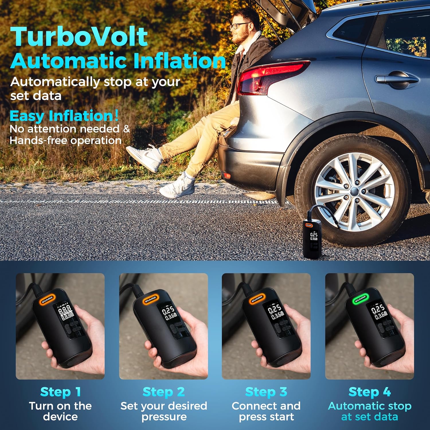 - 【Easy To Carry】Weighing under a pound, cordless design with a storage bag, this portable car tire inflator is easy to carry and store in compact spaces like cars, bicycle rack, or bags, making battery powered tire inflator ideal for emergencies, outdoor activities, or camping trips. The TurboVolt air inflator is ultra-portable, fitting easily in your glove box, backpack, or pocket.