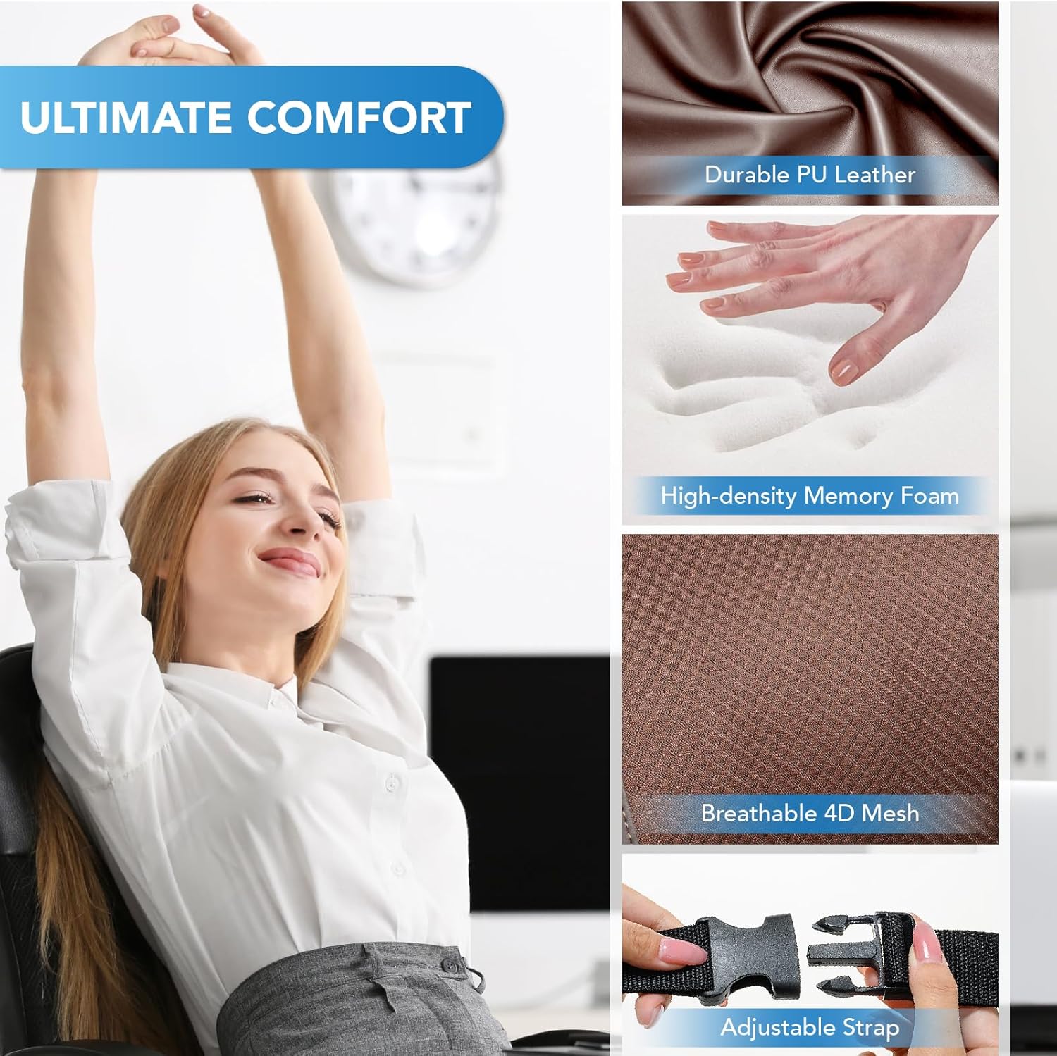 - Premium Quality - Durable PU leather can be used for a long time, maintaining an elegant appearance and easy to clean; breathable 4D mesh. Car back support ensures ultimate comfort for the driver during long-time driving. Pillow offers consistent support, style, and quality
