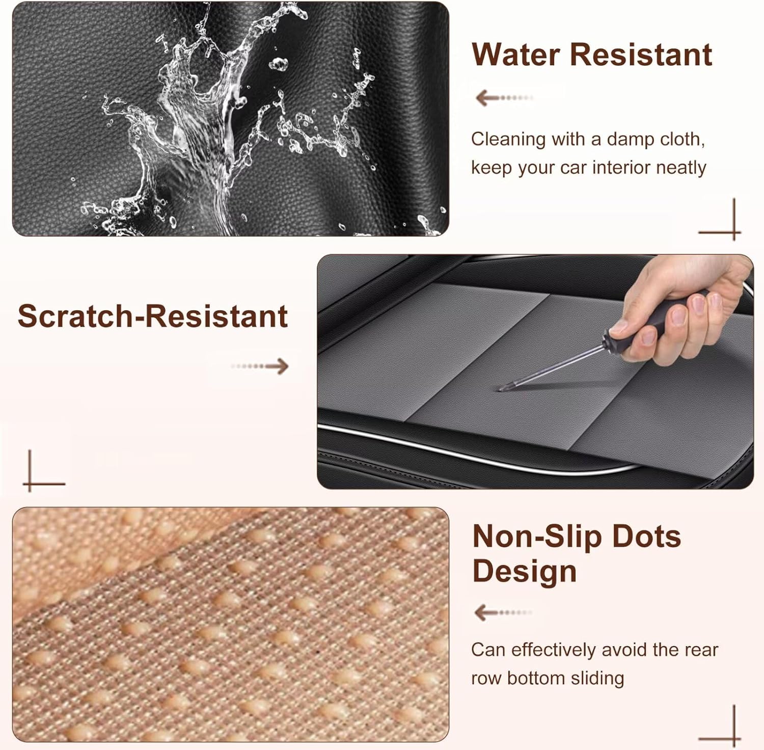 - 🚗 360° Ultra-Protection: The front two seats covers are designed with a full wrap-around to protect your original seats from external elements such as stains, pet hair and scratches. The seat cushion was used high quality leather that they are resistant to fading, durable and waterproof.