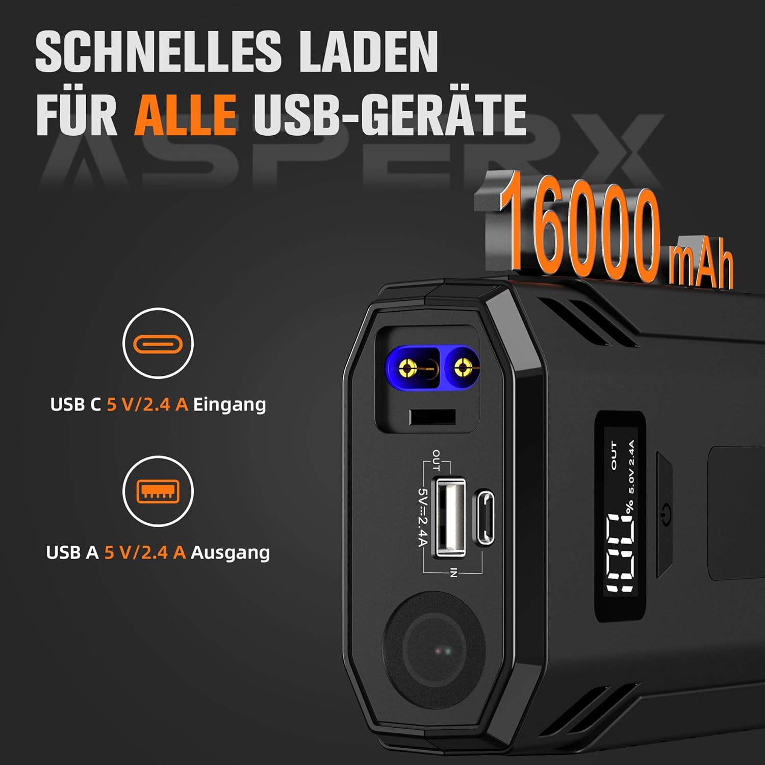 AsperX Car Jump Starter, 4000A Peak Battery Starter for All Gas or 10.0L Diesel Engines, 12V Battery Starter, Jump Box with USBA, Lithium Battery Booster with Built-in LED Light