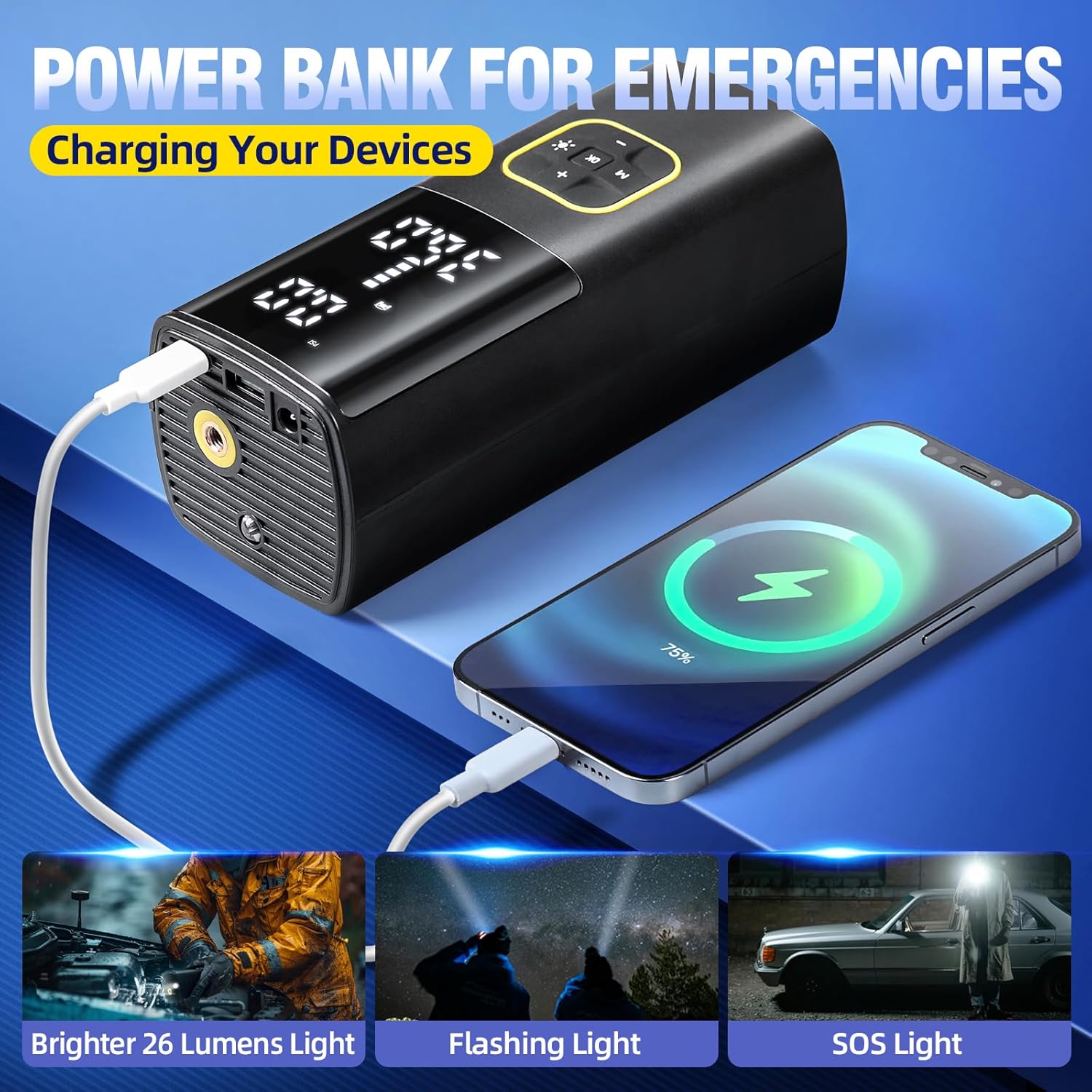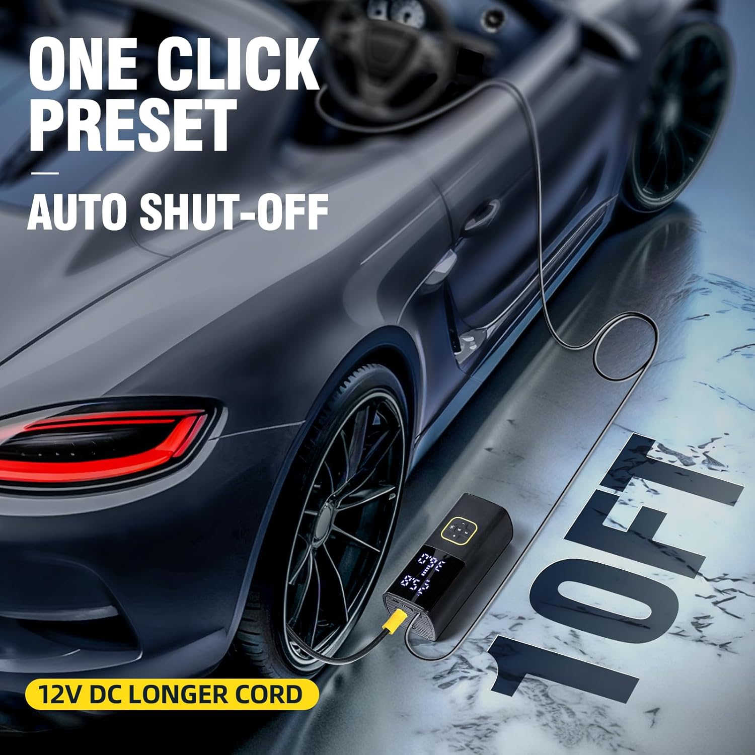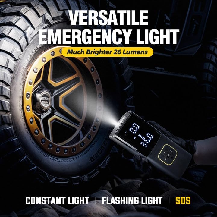 - 【Car Tire Inflator with Smart Auto-Shutoff & Digital Display】The large LED screen and high-precision chip shows real-time pressure, while the built-in chip automatically stops at your preset PSI—no overinflation risk.