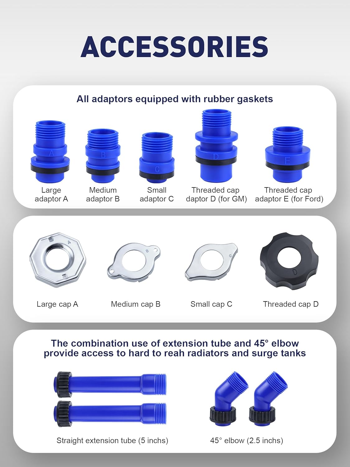 - This antifreeze funnel kit comes with 5 adaptors and 4 caps, works on almost any domestic or imported vehciles; and comes with 2 pcs straight extension tubes & 2 pcs 45° elbows allow access to caps located under shrouds or in fender wells