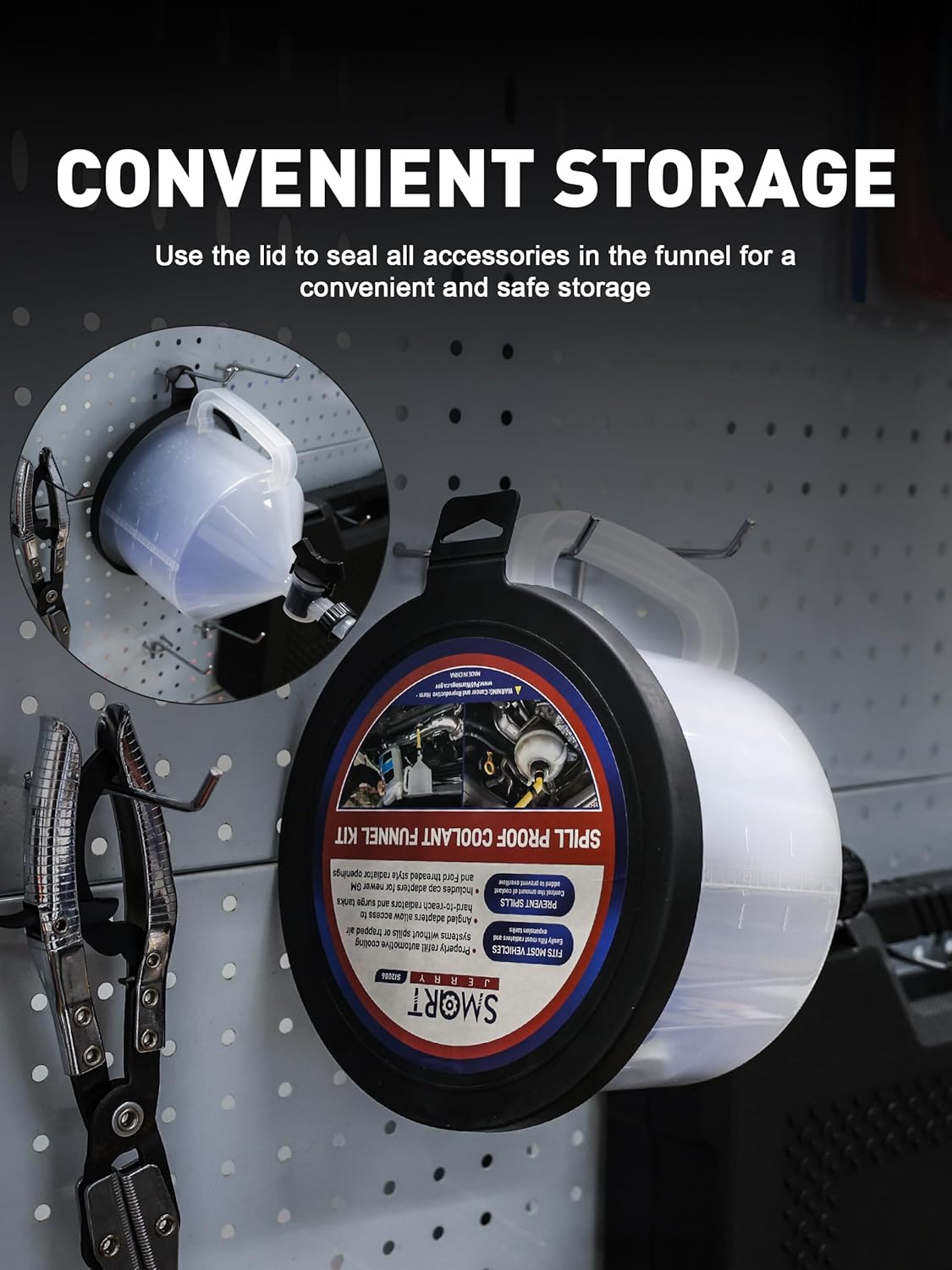 - Smart Jerry special designed funnel with adaptor equipped with rubber gasket ensures no spill and no lekage during changing radiator coolant, flushing systems, vacuum filling, or replacing hoses, keeps vehicle cooling system and and other engine parts clean