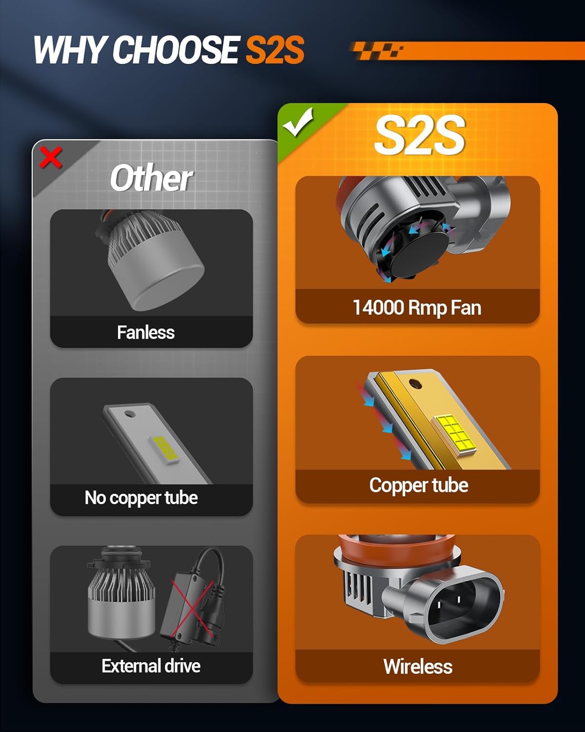 - Wide View And Safer: The S2S 9005 H11 fog bulb is equipped with advanced smart IC drives with radiating distances of 1600F, 90000 lumens and 6500K cool white, ensuring a clearly visible driving experience at night. Made of high-speed cooling fans and single copper tubes, our bulbs keep low operating temperatures and provide reliable performance at night for longer life of over 60,000 hours.