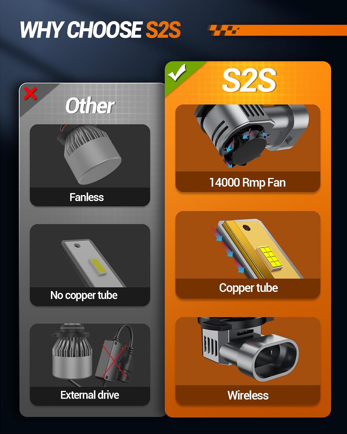 - Wide View And Safer: The S2S 9005 9006 fog bulb is equipped with advanced smart IC drives with radiating distances of 1600F, 90000 lumens and 6500K cool white, ensuring a clearly visible driving experience at night. Made of high-speed cooling fans and single copper tubes, our bulbs keep low operating temperatures and provide reliable performance at night for longer life of over 60,000 hours.