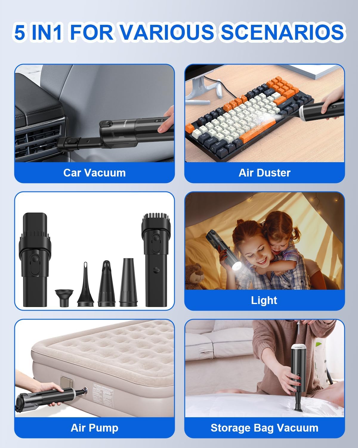 - 🚗Versatile Cleaning Attachments: This compact handheld car vacuum, measuring 11x2x2 inches, is easily portable and storable in places like drawers or glove boxes. With a range of included attachments, tackle every nook and cranny, from pet hair on upholstery to tight corners. It can also be applied to both swimming rings and inflatable pads.