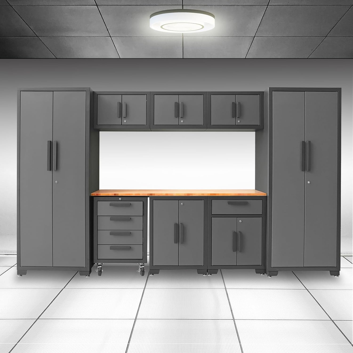 - The exceptional 9 piece Storage Cabinet Set Includes: Tall cabinet x 2, 2-door base cabinet x 1, 1-drawer 2-door base cabinet x 1, 4-drawer with casters x 1, wall cabinet x 3, Pressed Wooden Board x 1 and features a fully welded steel structure for added support