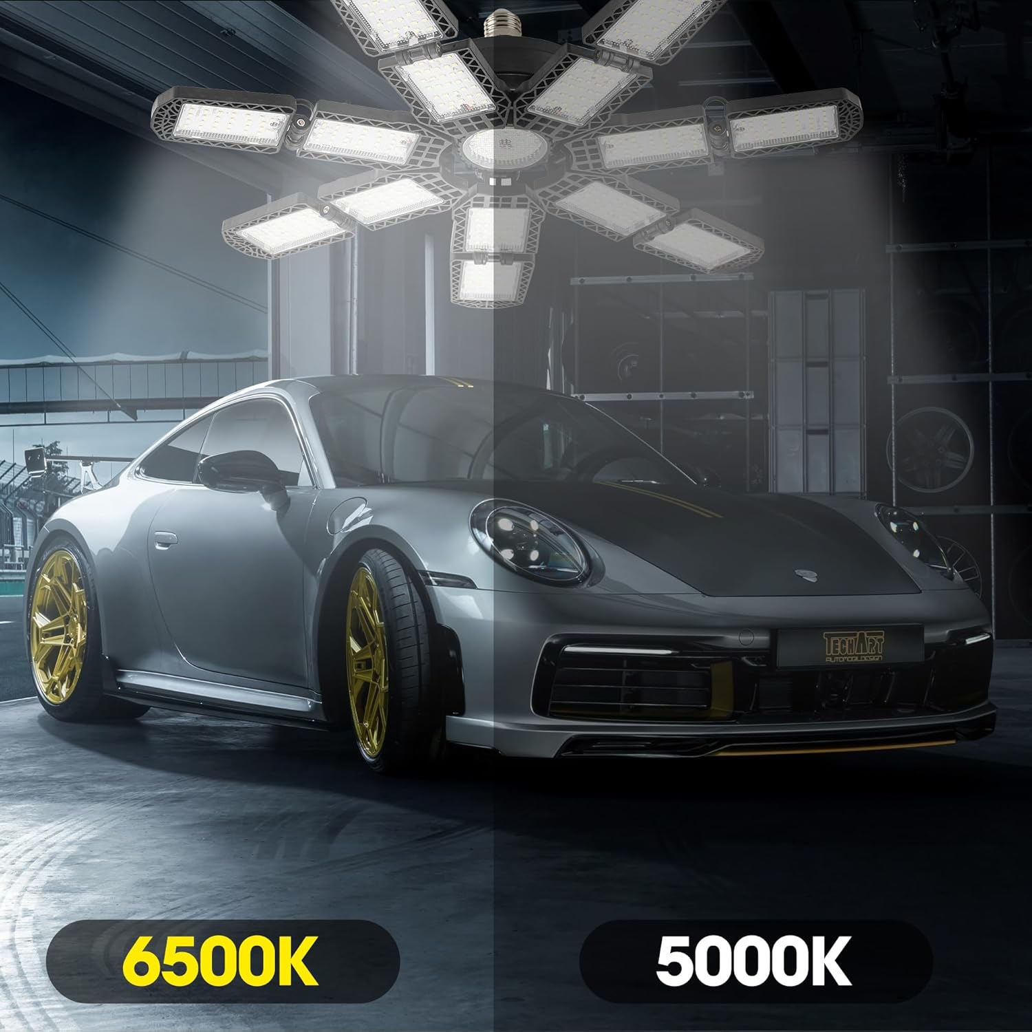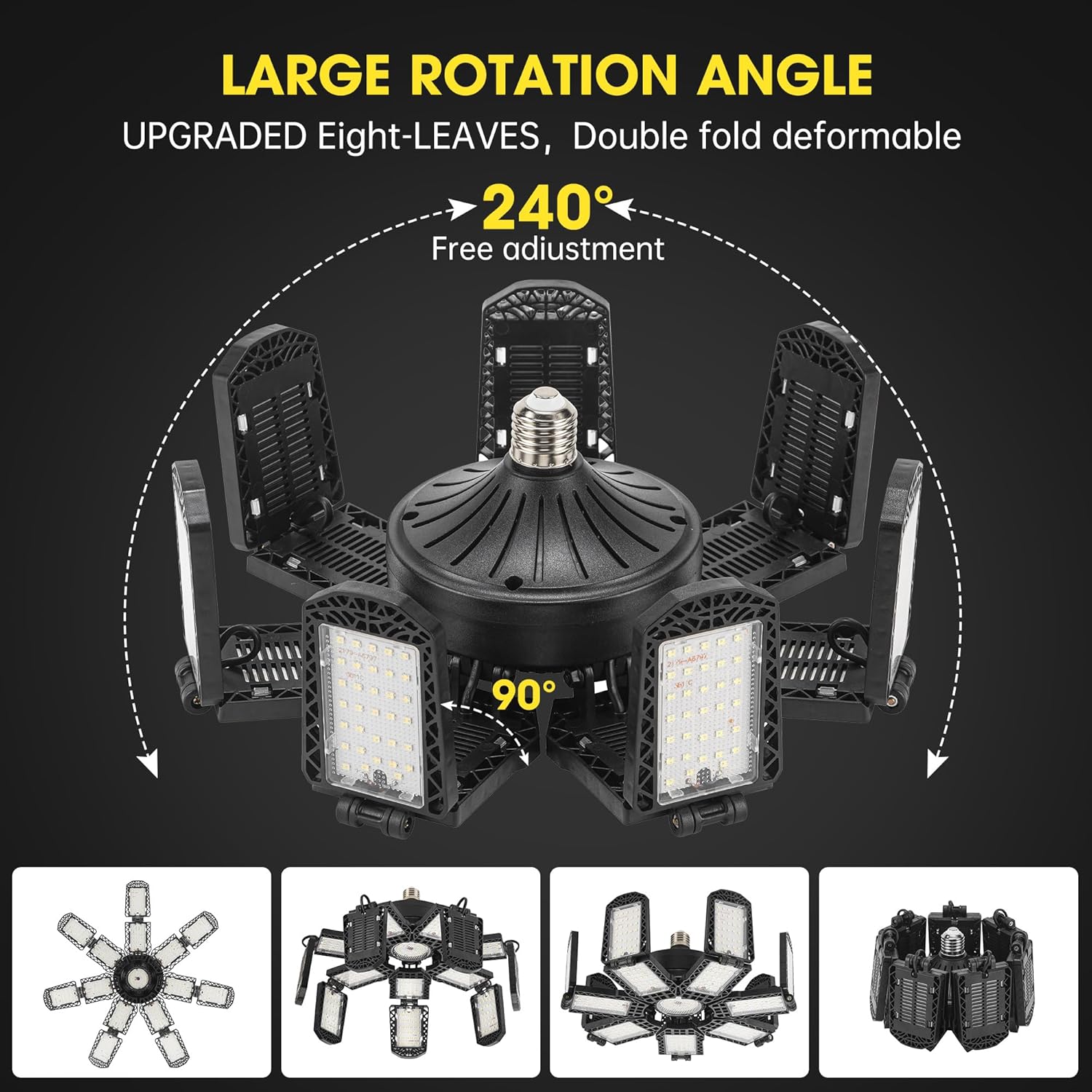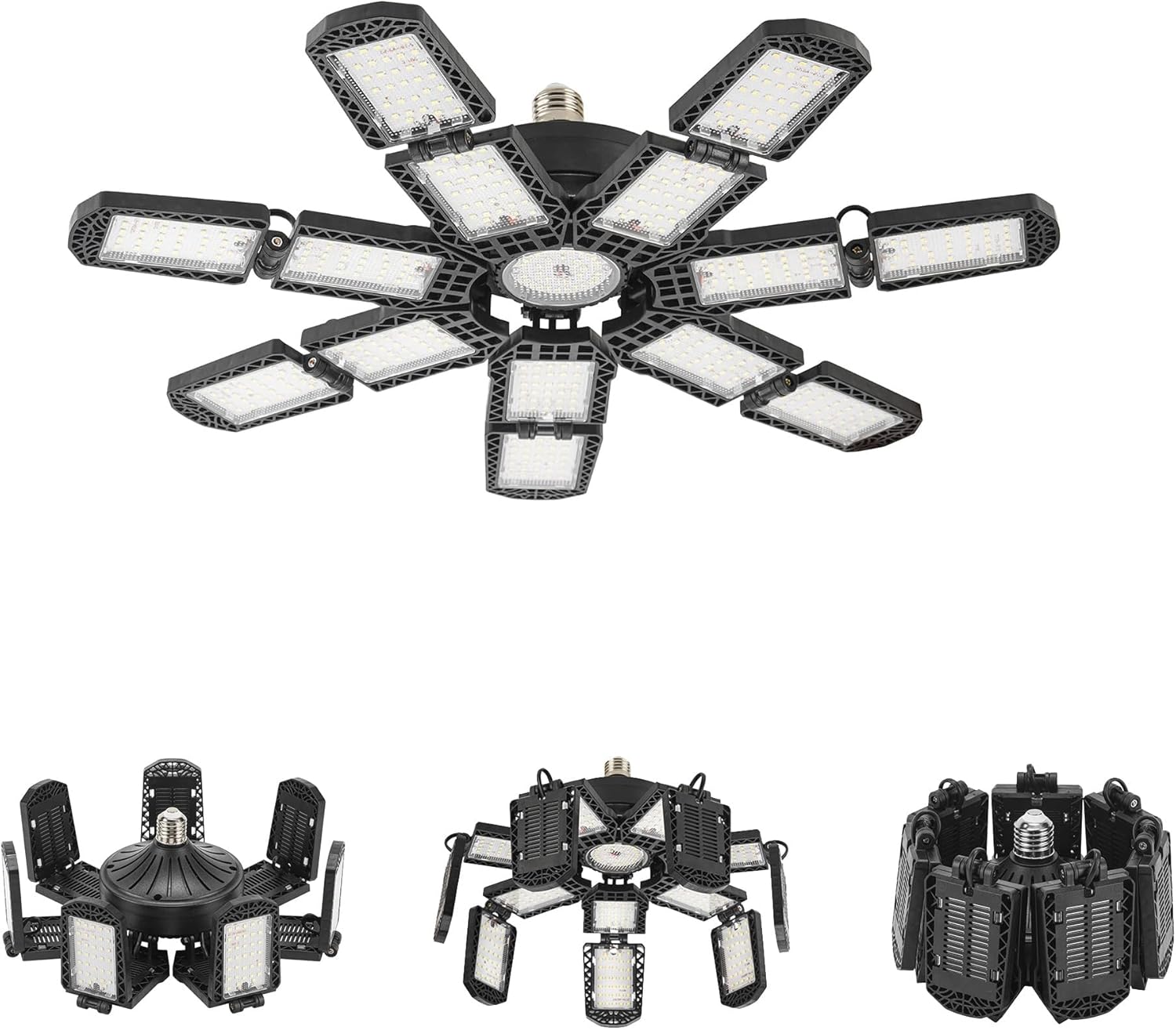 - 【14+1 Deformable Super Bright LED Garage Lights】- With 14+1 ultra-bright adjustable LED pannels. It features with 15*24 PCS top quality diodes that total 25000 lumens, CRI80+, 6500K daylight can give you 85% energy saving for your garage. The upgraded lighting fixtures have sufficient brightness and are the preferred choice for work.