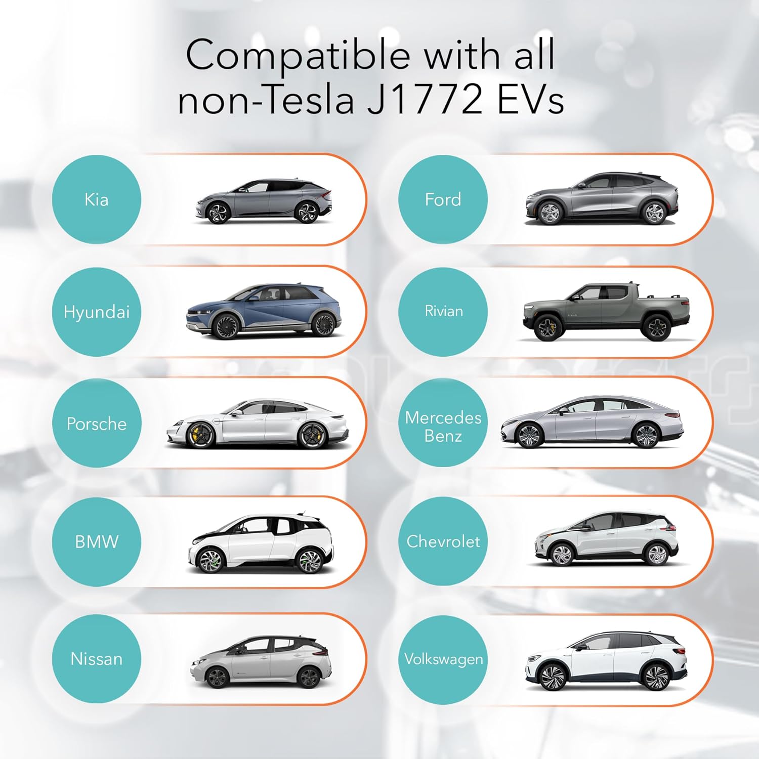 - J1772 CHARGER - This Level 1 / Level 2 Charger is compatible with all EVs using the J1772 charging standard; whether you own a BMW, Ford, Honda, Hyundai, Kia, Porsche or Chevy, this charger will work seamlessly with your vehicle