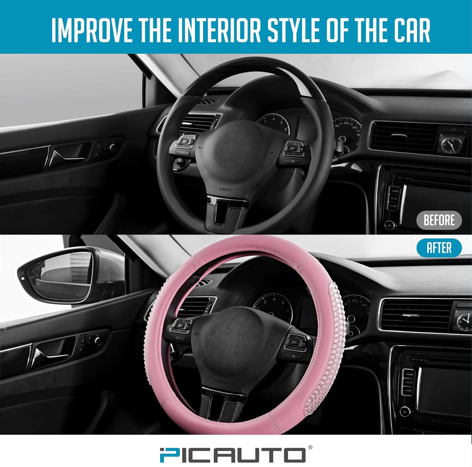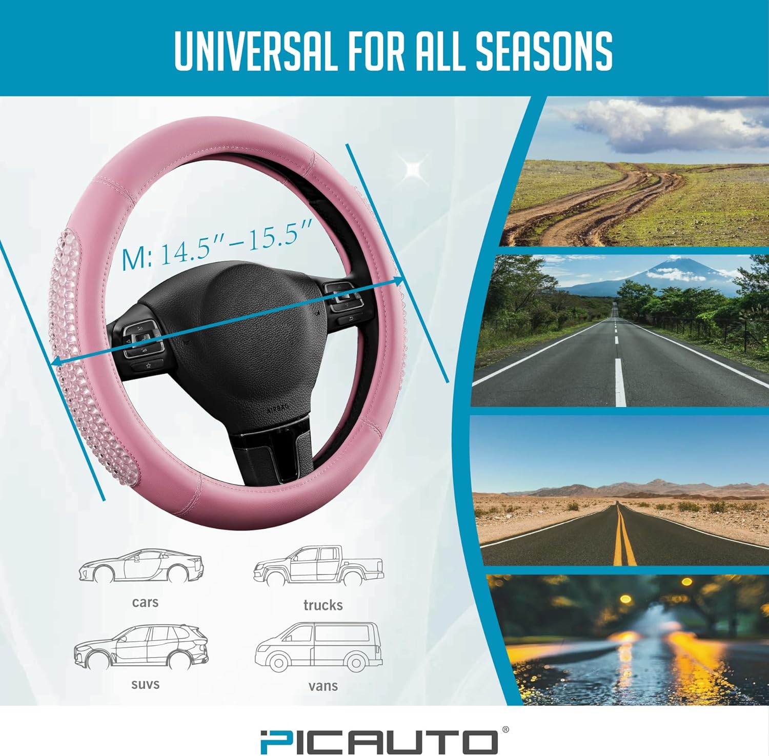 PIC AUTO Gel Particles Steering Wheel Cover, Pink Luxury Leather Car Steering Wheel Protector, Universal Fit 14.5"-15.5" Anti-Slip Car Interior Accessories for Girls & Women