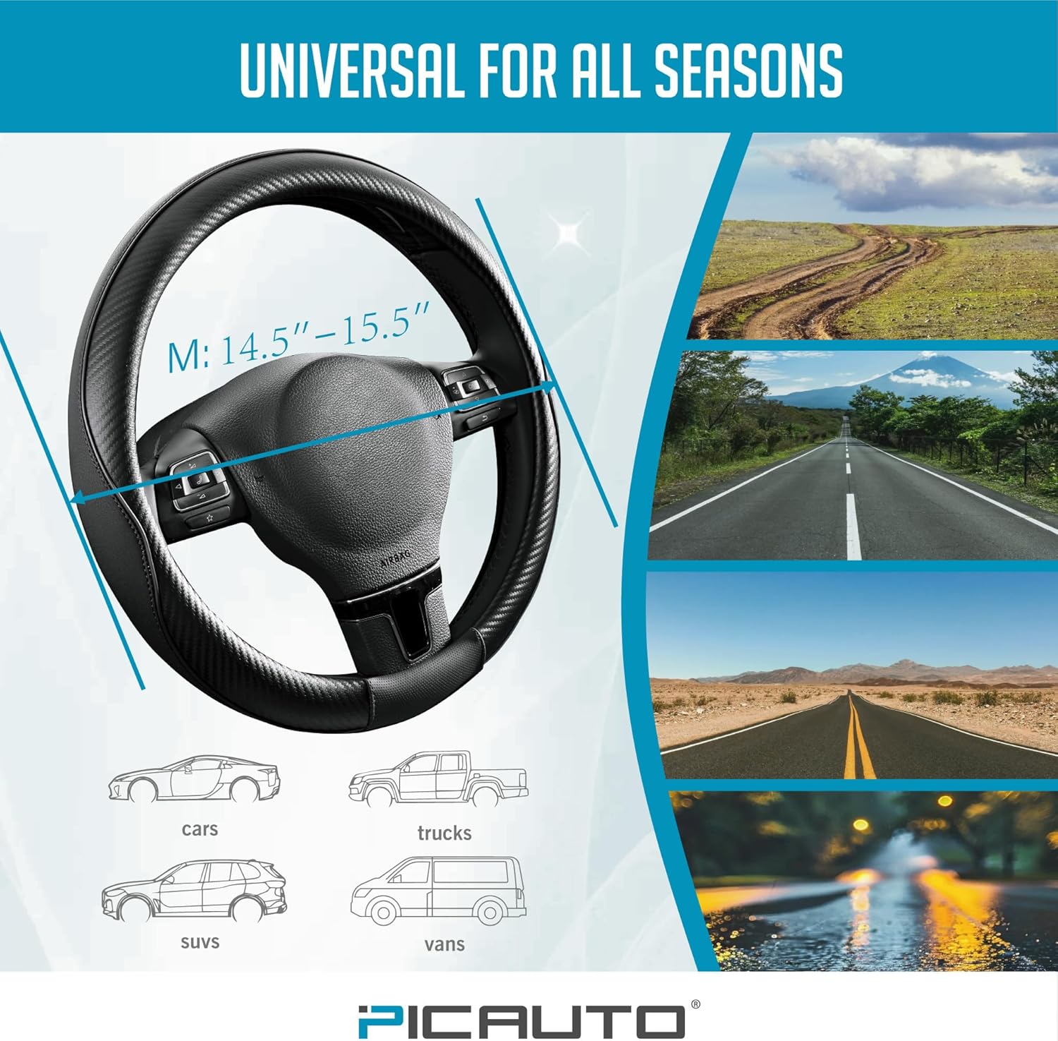 - DESIGN - The stylish piping combined with carbon fiber accents gives the steering wheel cover a sporty and modern look, ideal for drivers who want to add a touch of sophistication and performance to their vehicle’s interior. It’s perfect for those who appreciate both form and function.