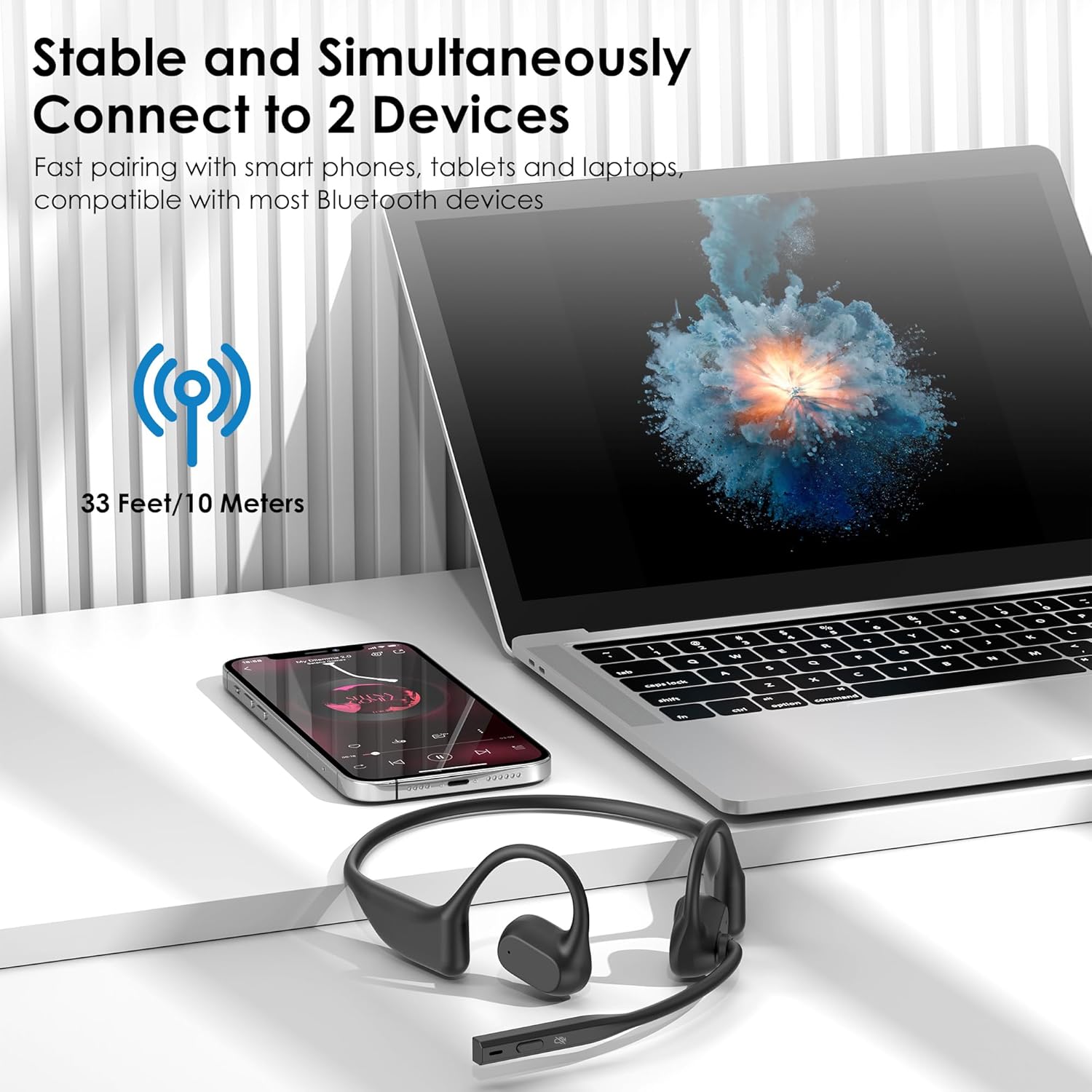 Open Ear Headphones with Mic, Bluetooth 5.3 Headset with AI Noise Cancelling Mic & Mute Function, Wireless Headset for Work, Sports, Drive (Dark Black)