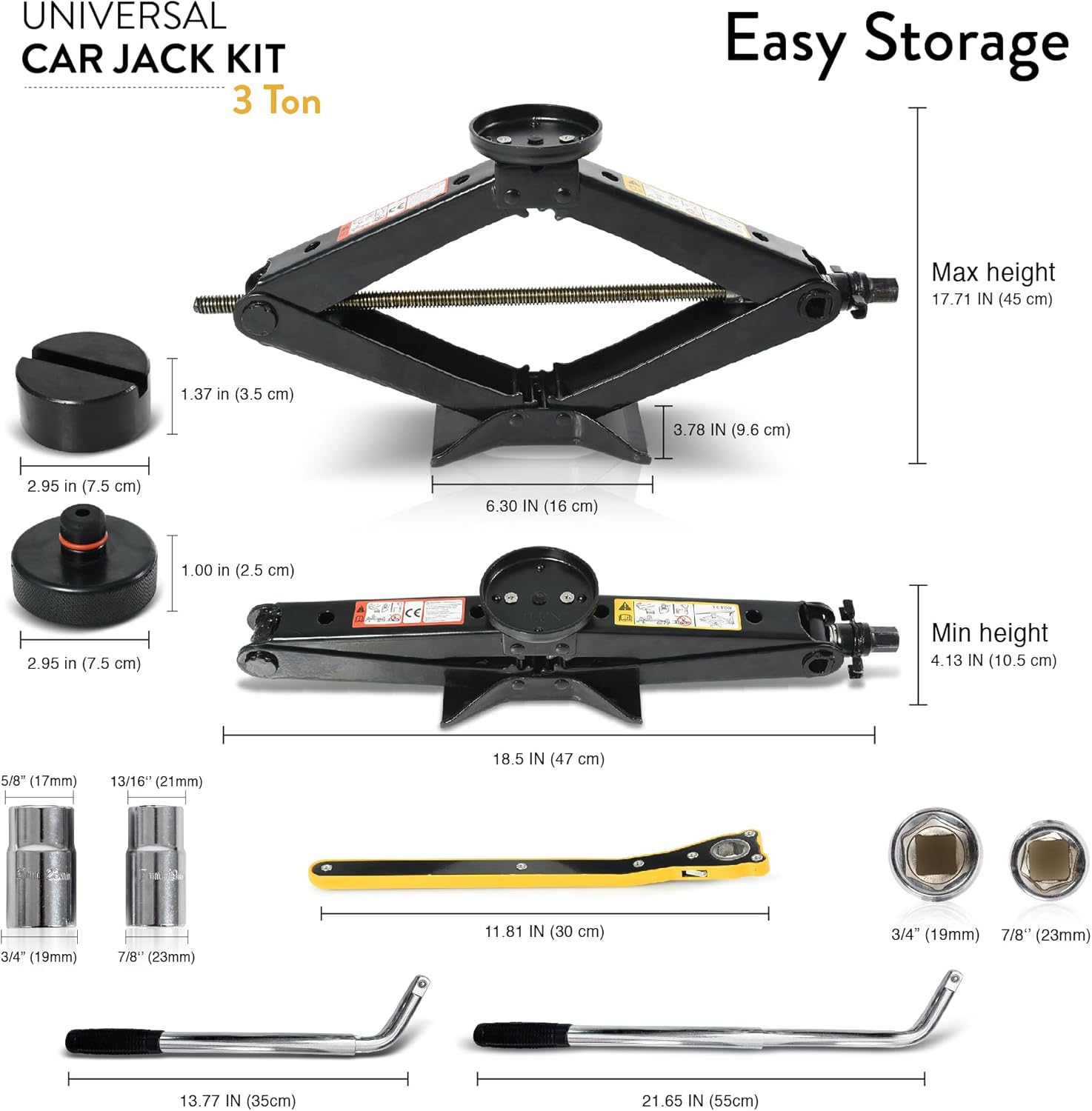 Car Jack Kit with Tesla Pad & Universal Rubber Pad | Scissor Jack for Car 3 Ton (6,600 lbs) - Tire Jack Tool Kit | Portable, Ideal for SUV and Auto - Universal Car Emergency Kit with Lug Wrench