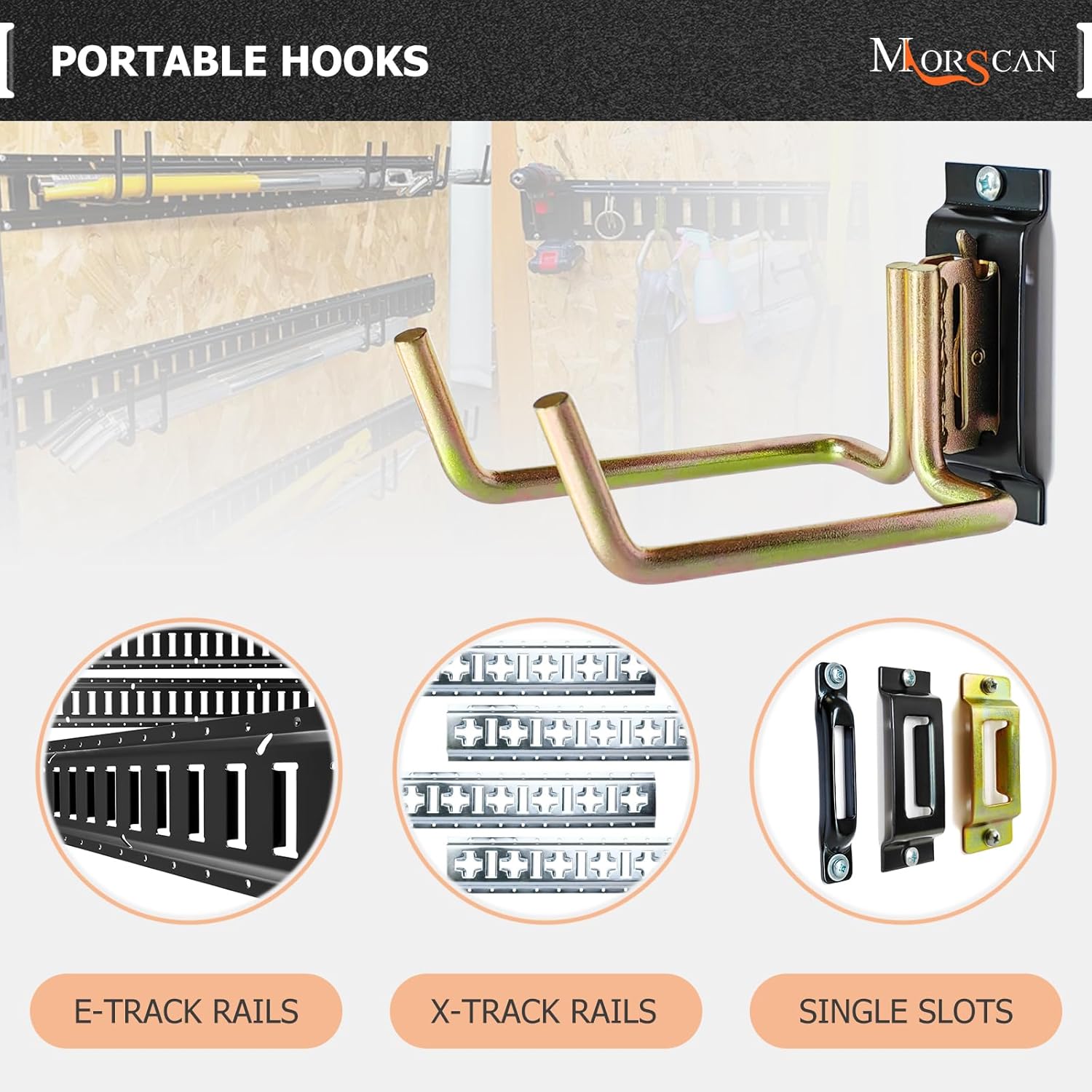 - HEAVY DUTY HOOKS - Strong hooks fit for all E Track/X Track trailer tie-down rails or E port single slots. With 500 pound working load limit, 1,400 pound break strength. Hang various tools, accessories, extension cords, straps, cables, wires, hoses, ropes, ladders, bikes, car tires with this sturdy E-Track Shovel/Tool hanger.