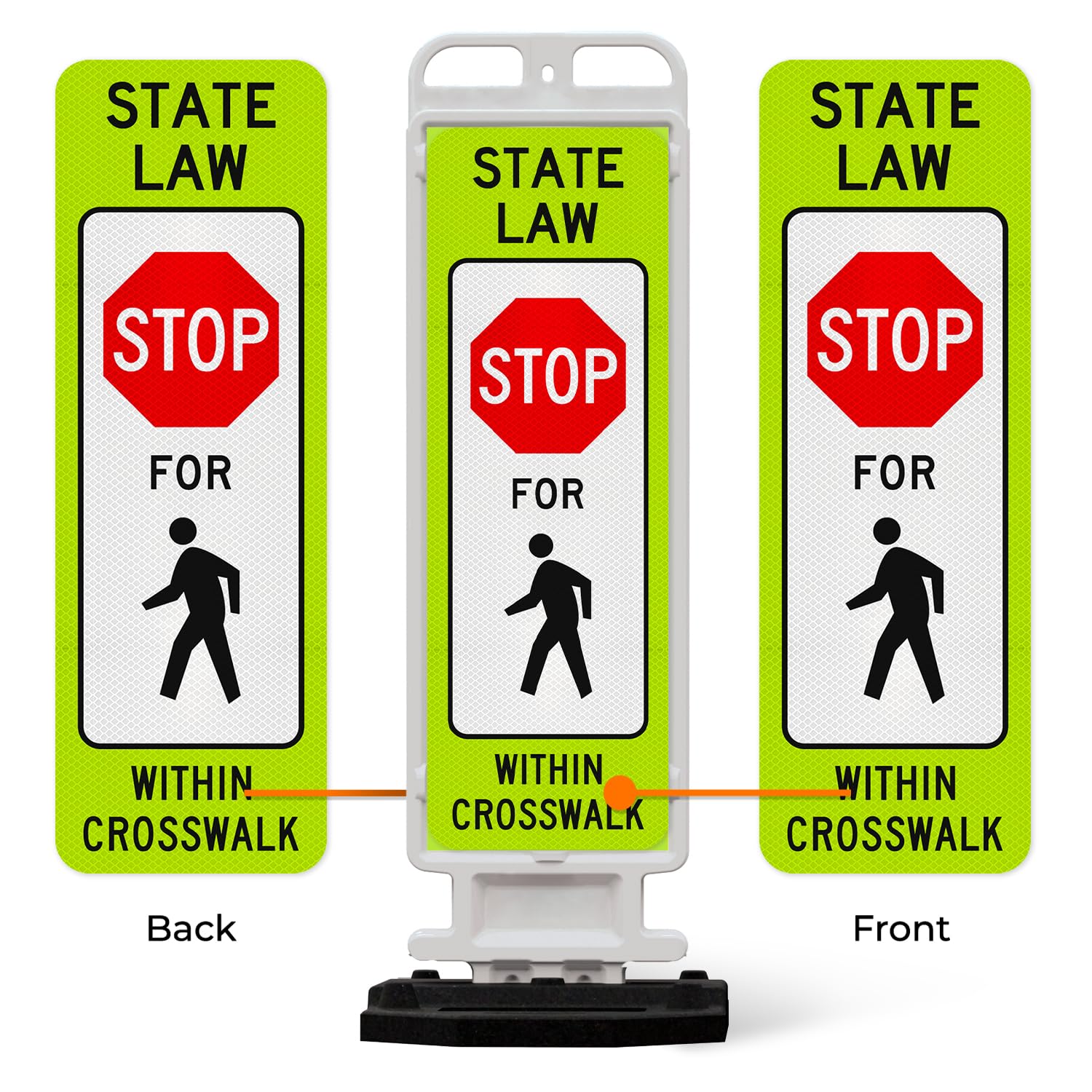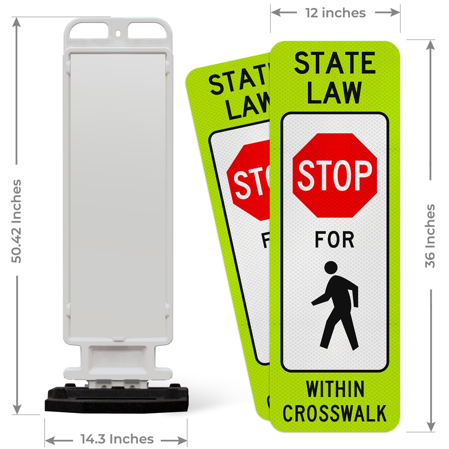 State Law Stop for Pedestrian Within Crosswalk MUTCD R1-6a Sign, Double Sided 3M Engineer Grade Reflective, Portable Rubber Base, Impact Resistant Plastic Frame