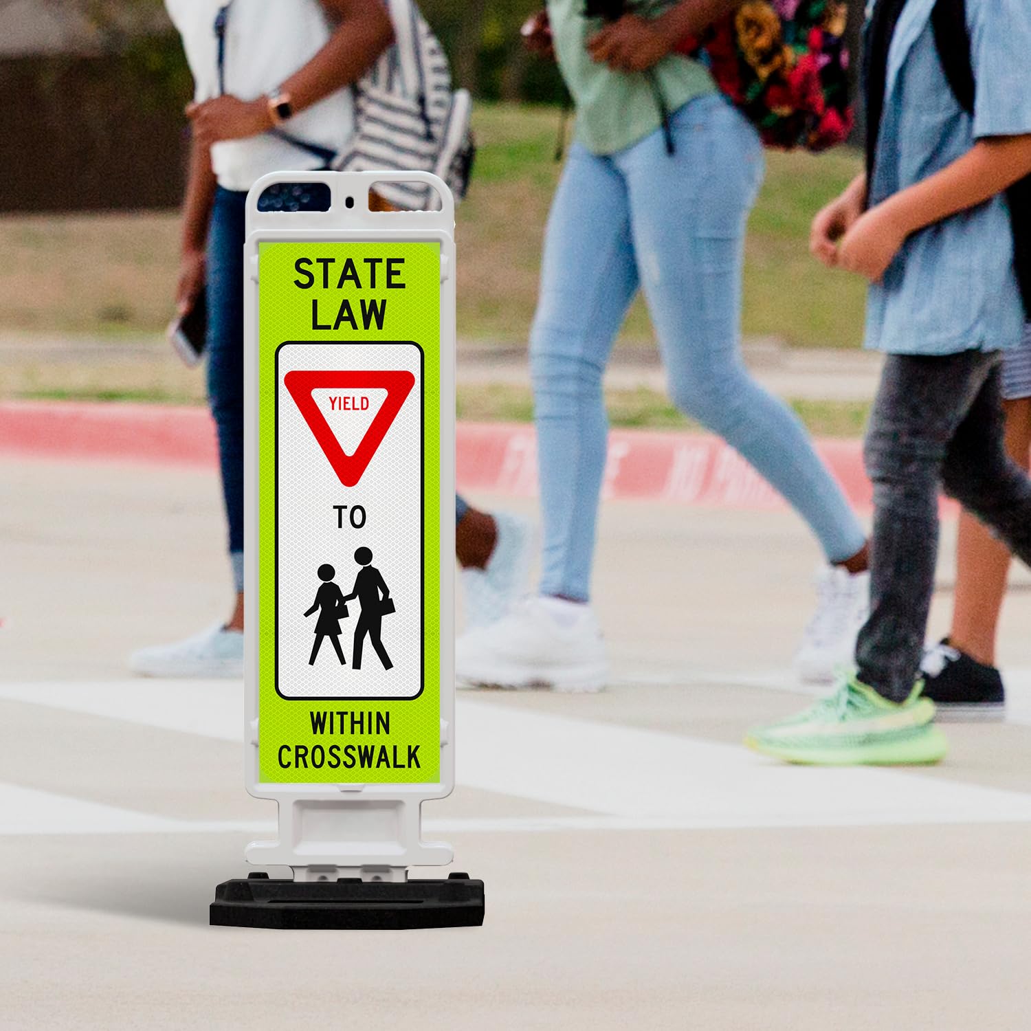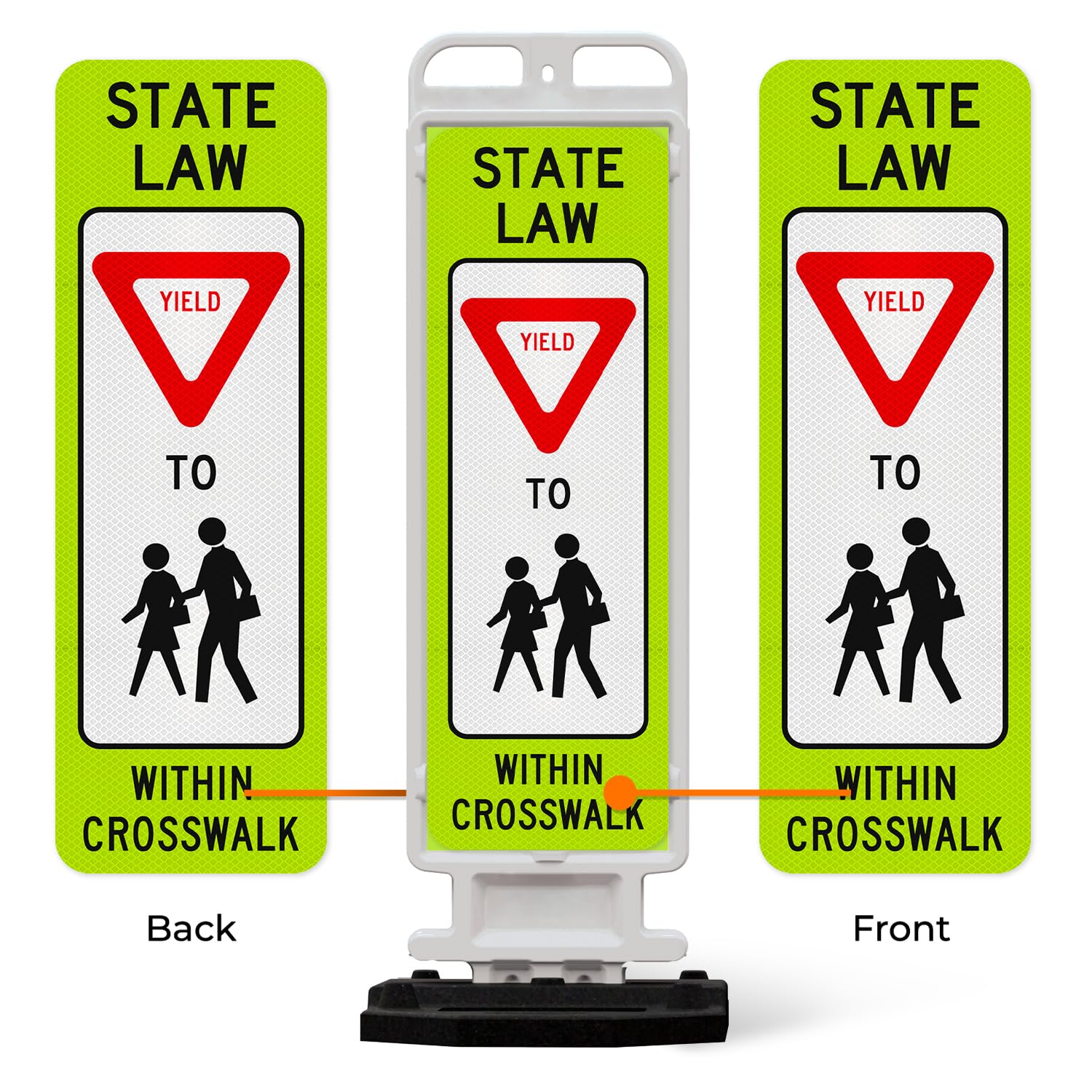 State Law Yield for Pedestrian in Crosswalk R1-6a MUTCD Sign, Double Sided 3M Engineer Grade Reflective, Portable Rubber Base, Impact Resistant Plastic Frame