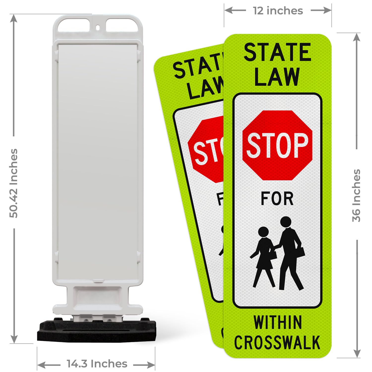 State Law Stop for Pedestrian in Crosswalk MUTCD R1-6a Sign, Double Sided 3M Engineer Grade Reflective, Portable Rubber Base, Impact Resistant Plastic Frame