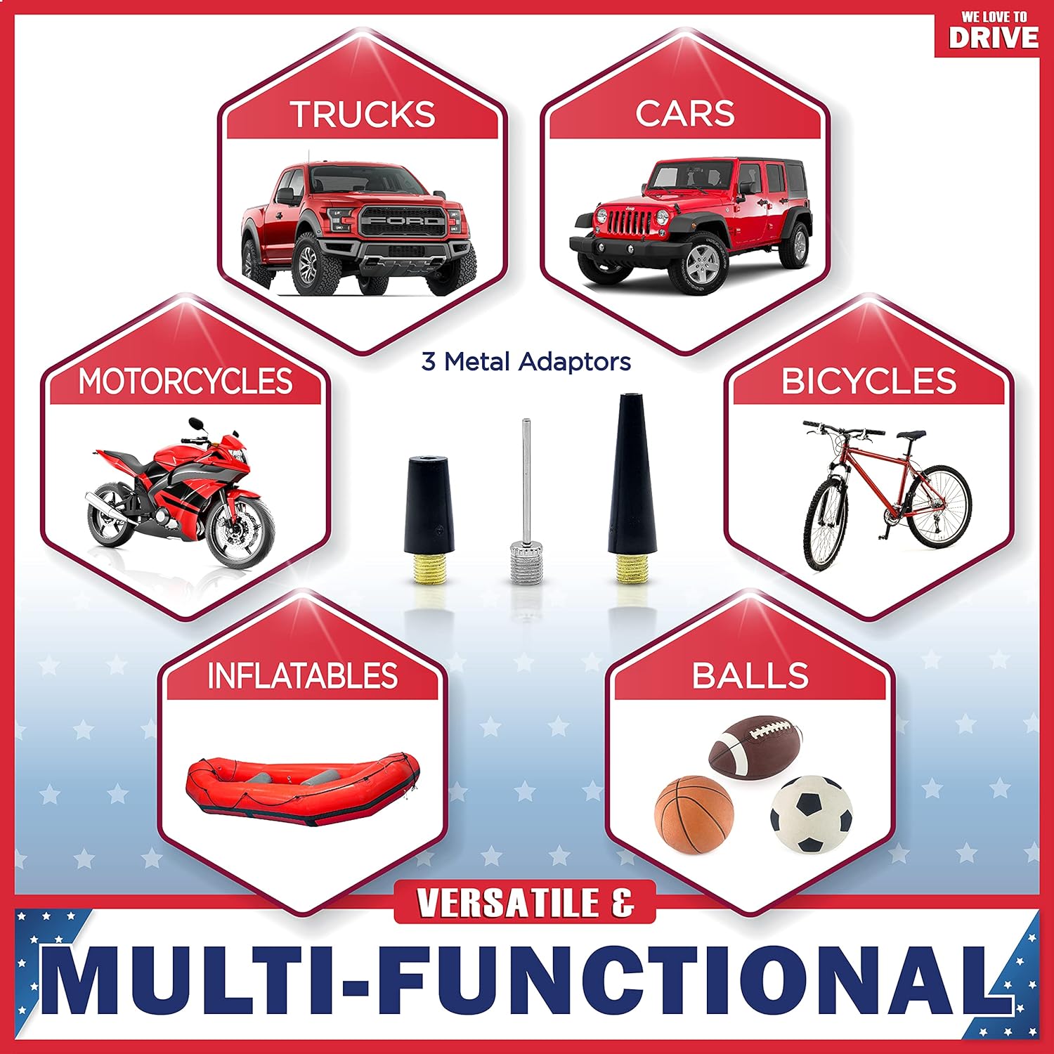 - Adaptable Air β Use your 12V air compressor kit to inflate a variety of tires and sporting equipment. Compress air up to 150 PSI and channel it through your choice of 3 different threaded adaptors. Reaches front and back tires of all cars, trucks, and SUVs. With the 3 inflation tips included, the compressor will also inflate bikes, motorcycles, balls, air mattresses, sports equipment, and other inflatables.