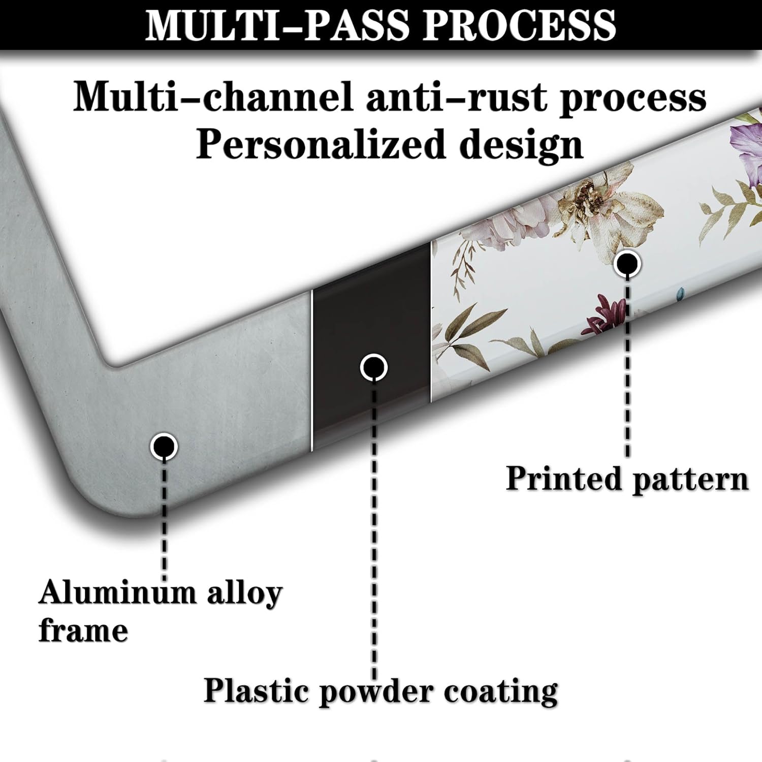- ALUMINUM FRAME: This License Plate Frame is crafted from high-quality aluminum that is resistant to corrosion, rust, and harsh weather conditions. Its rugged reliability design ensures a long lifespan, making it capable of withstanding car washes and extreme weather, providing you with a reliable and stylish solution for your vehicle.
