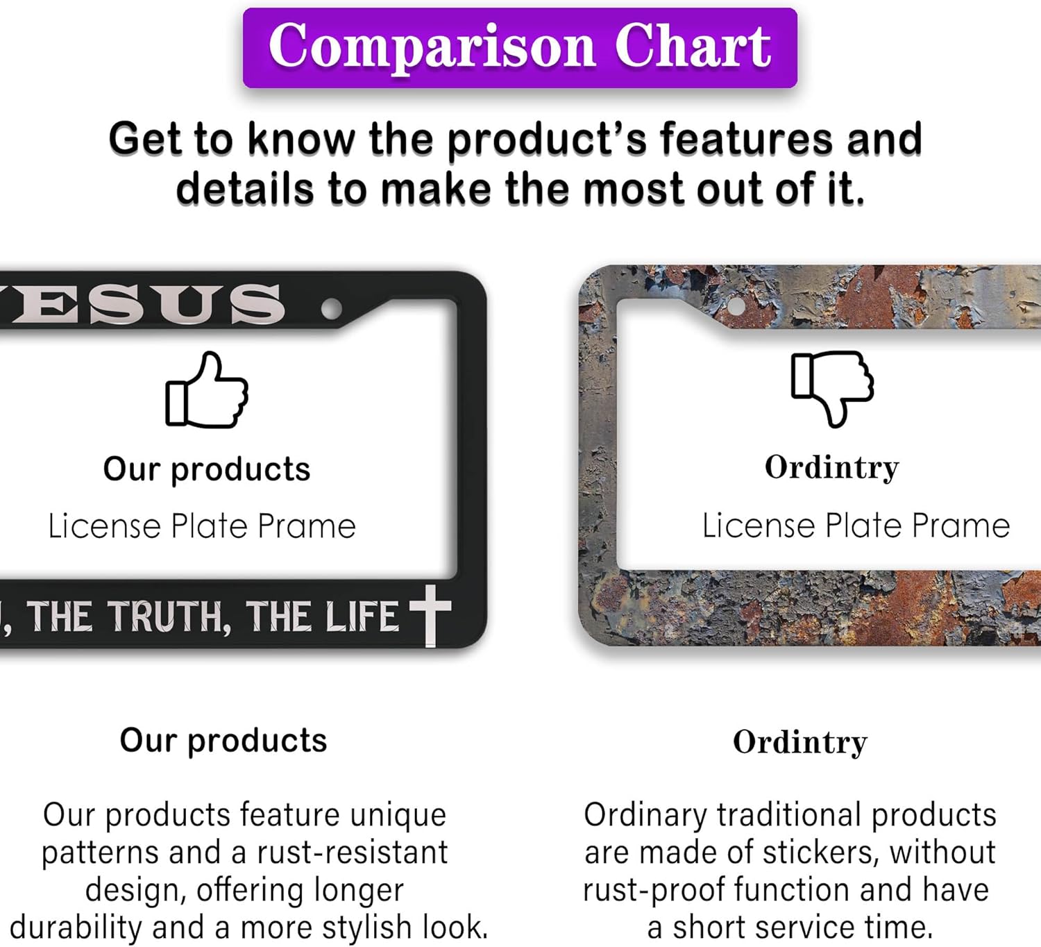 - ALUMINUM FRAME: This License Plate Frame is crafted from high-quality aluminum that is resistant to corrosion, rust, and harsh weather conditions. Its rugged reliability design ensures a long lifespan, making it capable of withstanding car washes and extreme weather, providing you with a reliable and stylish solution for your vehicle.