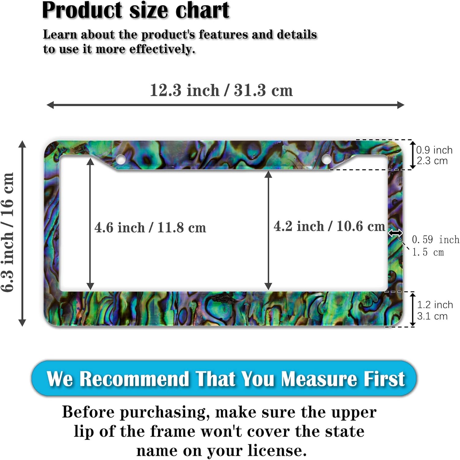 - STANDARD FRAME SIZE: Ensure a perfect fit by checking the dimensions to avoid covering your state name. These frames are specifically designed to fit standard American license plates measuring approximately 12.3" x 6.3" (16 x 31 cm). for most license plates in the U.S.