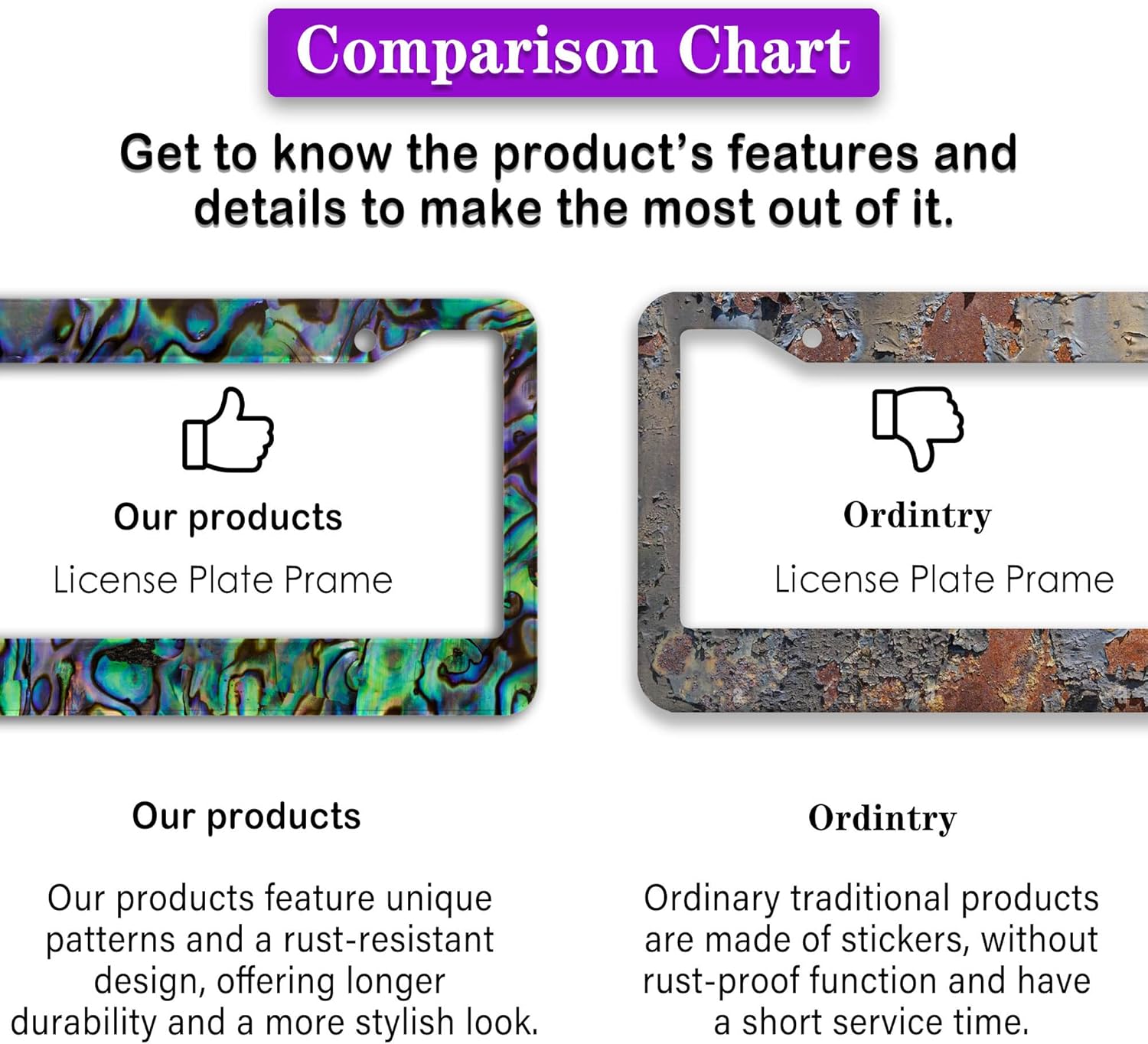 - ALUMINUM FRAME: This License Plate Frame is crafted from high-quality aluminum that is resistant to corrosion, rust, and harsh weather conditions. Its rugged reliability design ensures a long lifespan, making it capable of withstanding car washes and extreme weather, providing you with a reliable and stylish solution for your vehicle.