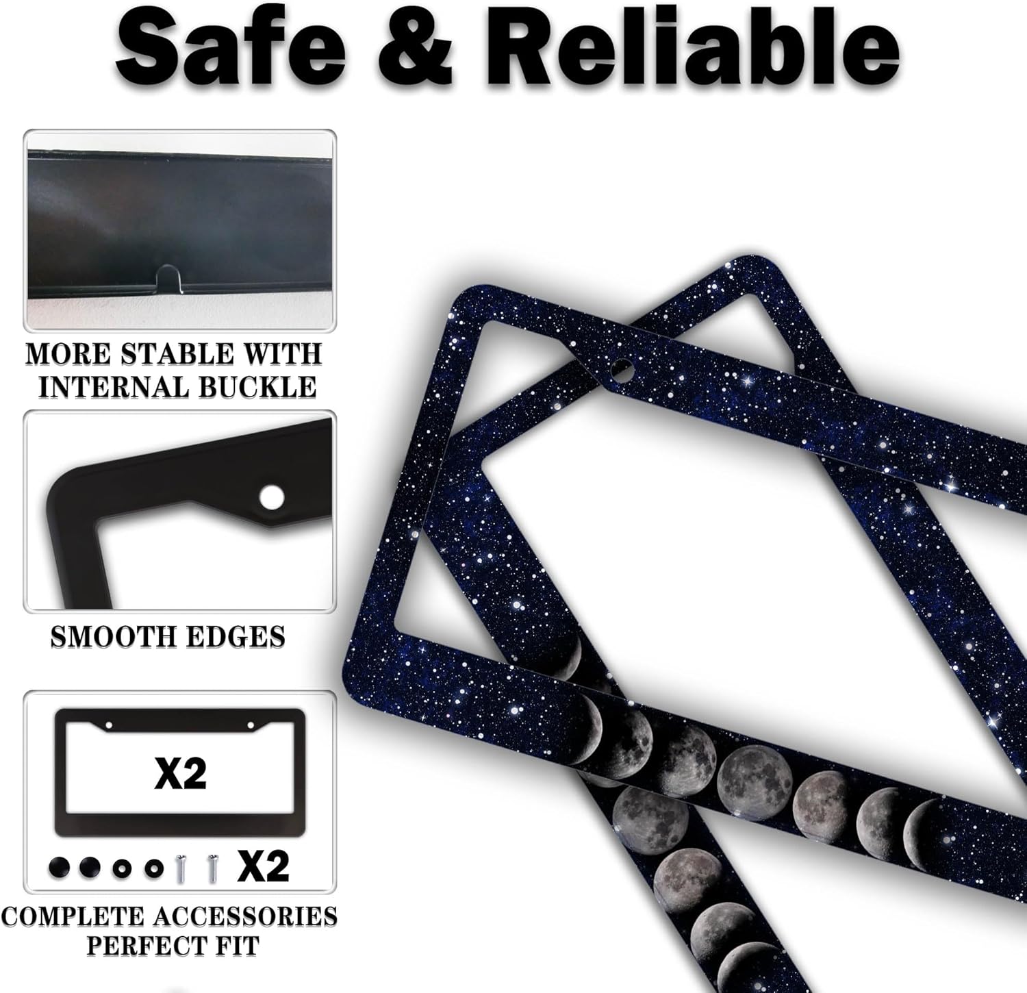 Automotive Exterior Accessories Black and White License Plate Frames Celestial Moon Phases Aluminum Metal Car Accessory 2 Pack with Screw Covers Set