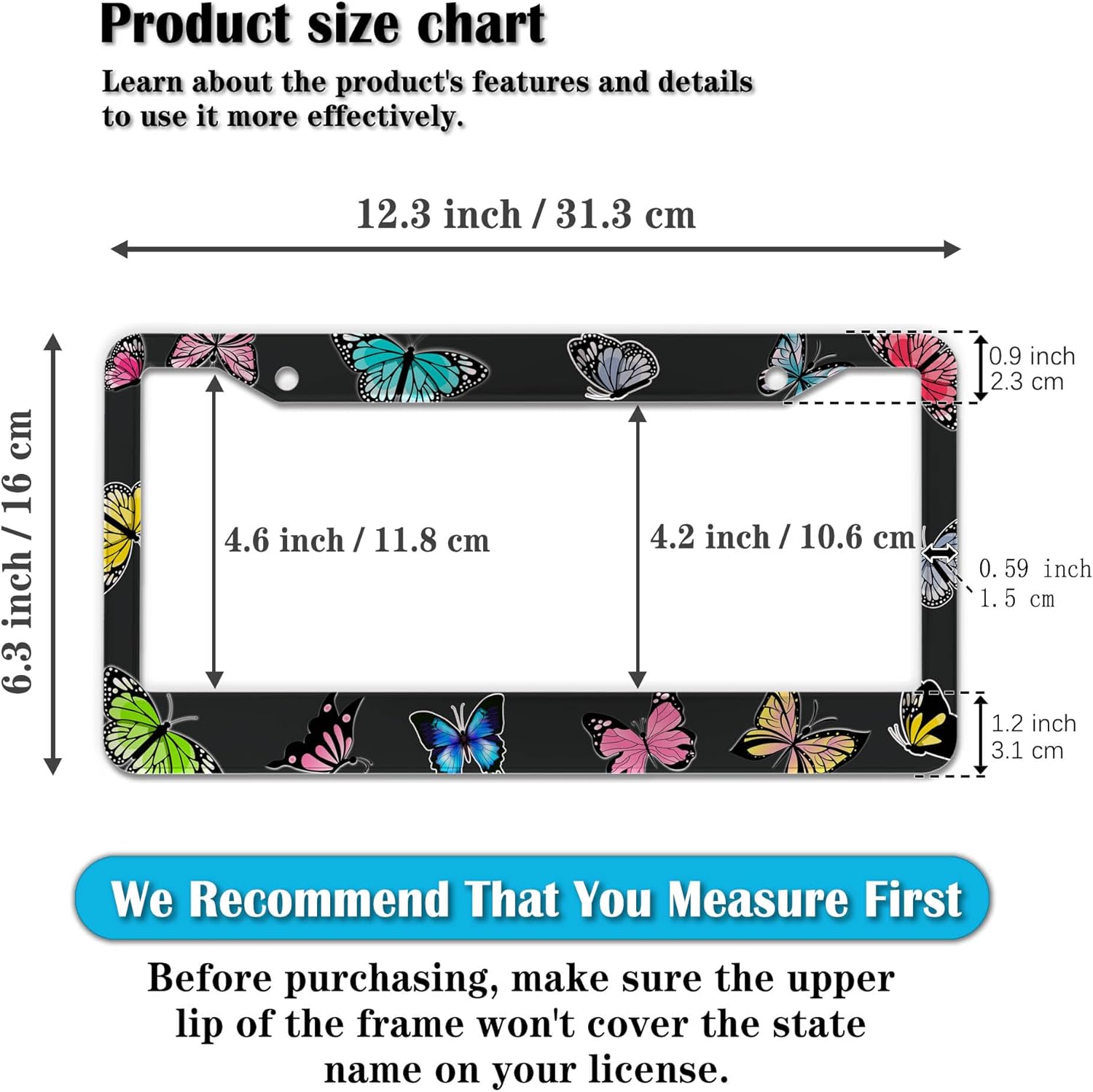 - STANDARD FRAME SIZE: Ensure a perfect fit by checking the dimensions to avoid covering your state name. These frames are specifically designed to fit standard American license plates measuring approximately 12.3" x 6.3" (16 x 31 cm). for most license plates in the U.S.