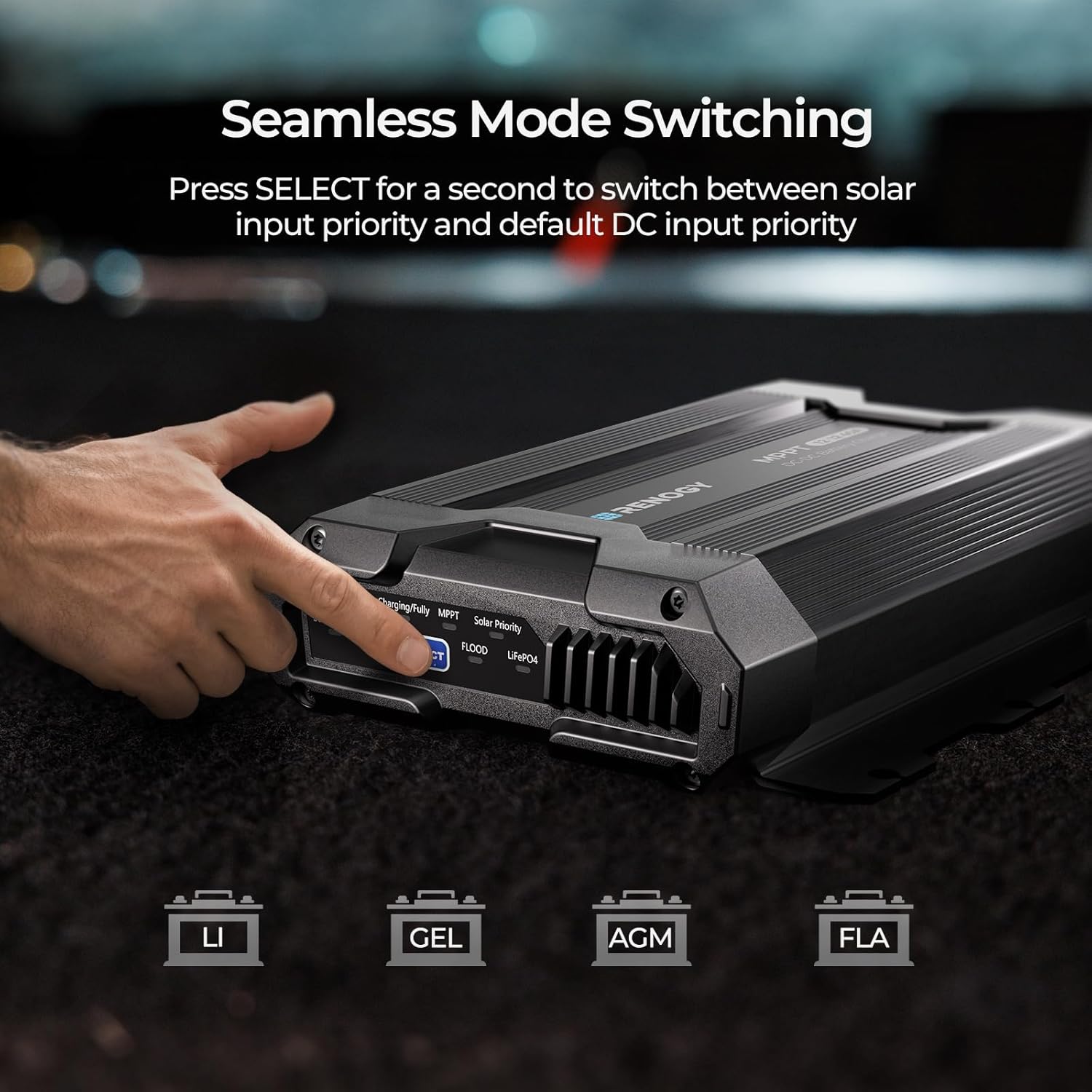- ๐๐ฐ๐จ ๐๐ก๐๐ซ๐ ๐ข๐ง๐ ๐๐ฉ๐ญ๐ข๐จ๐ง๐ฌ- Renogy 40A DC-DC MPPT battery charger offers two versatile charging modes to maximize efficiency. The charger defaults to DC input priority mode. Battery chargers will automatically switch to the alternate charging mode when the input voltage in the primary mode falls below the default voltage. This DC-DC charger ensures ๐ฆ๐๐ฑ๐ข๐ฆ๐ฎ๐ฆ ๐๐๐๐ข๐๐ข๐๐ง๐๐ฒ in charging your battery whether you're on the road or parked