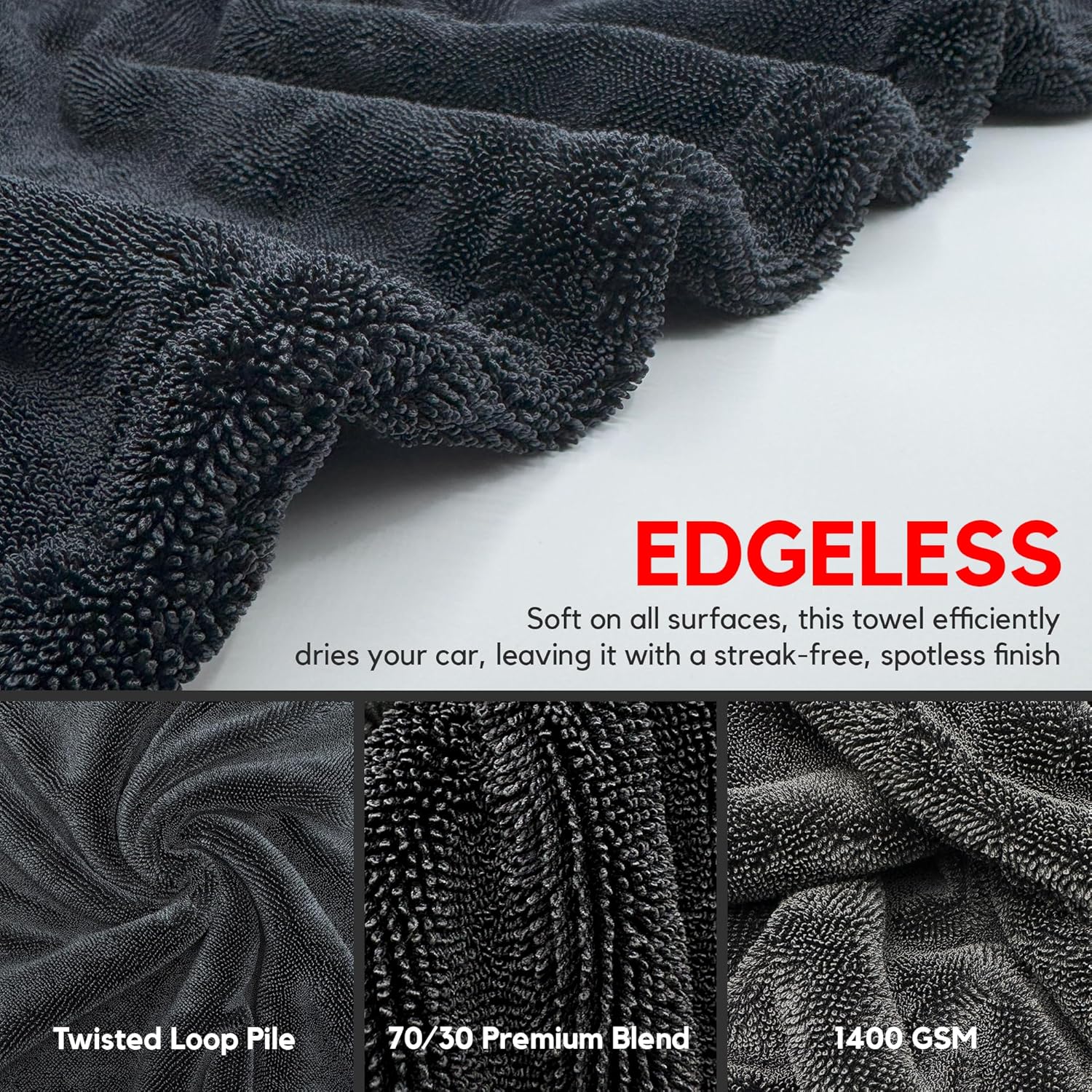 Extra Large Car Drying Towel - 1400 GSM Edgeless Twisted Loop Design - 70/30 Blend Microfiber Towels for Cars, Trucks, SUVs - Superior Absorption, Streak-Free - 24" x 36", Black