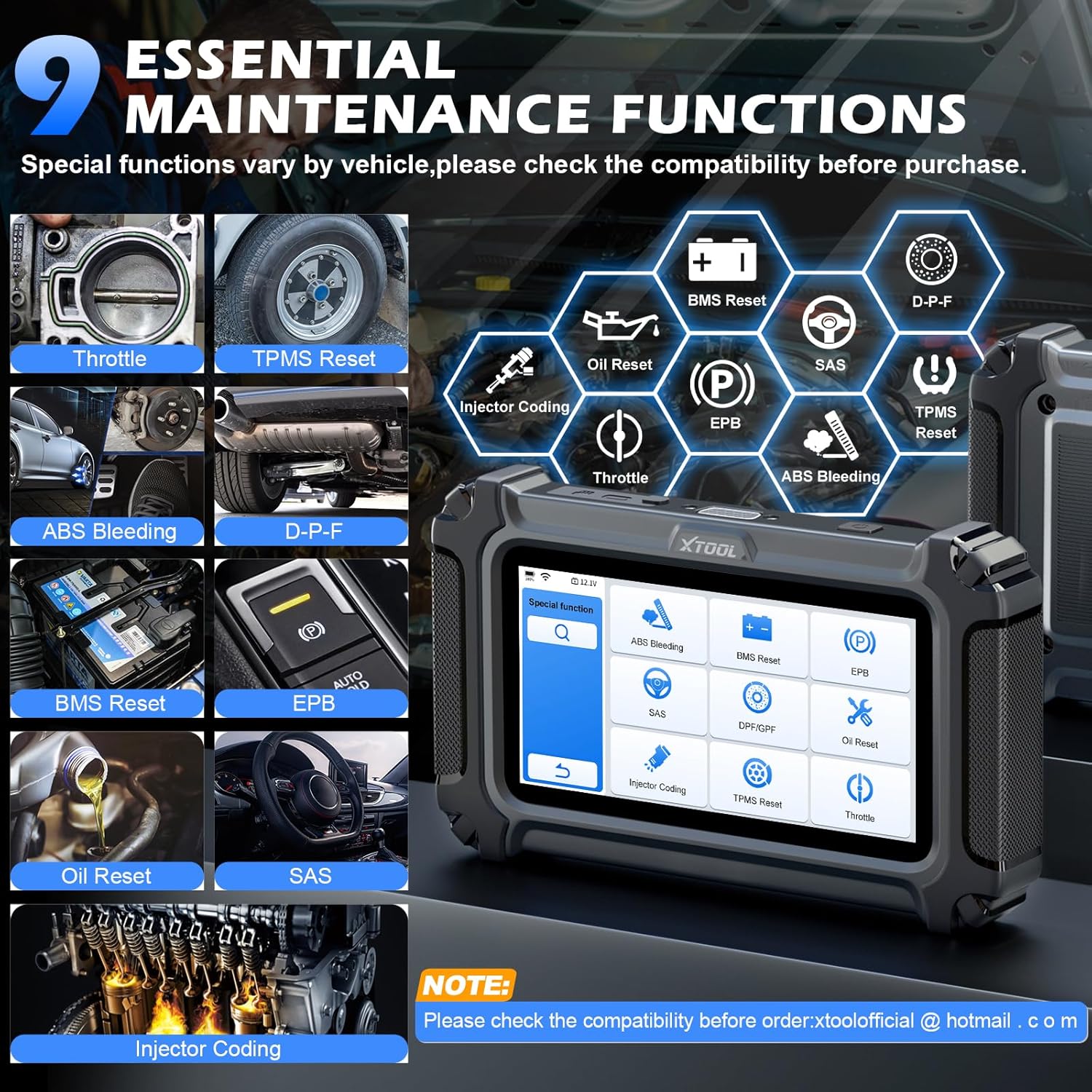 - 2025 Comprehensive OBD2 Scanner with 9 Reset Functions: XTOOL D5 is an advanced car code reader and reset tool featuring 9 essential reset functions, including EPB Brake Reset, SAS Calibration, BMS Reset, Throttle Body/Position Relearn, TPMS Reset, ABS Bleeding, Injector Coding, Oil Reset, and more. Whether youâre dealing with everyday maintenance or troubleshooting faults, the D5 OBD2 car diagnostic tool ensures youâre prepared for any situation. Upgrade today and experience a smarter, more efficient way to manage your vehicleâs maintenance. Please check the compatibility before purchase as the funtions not available on all cars