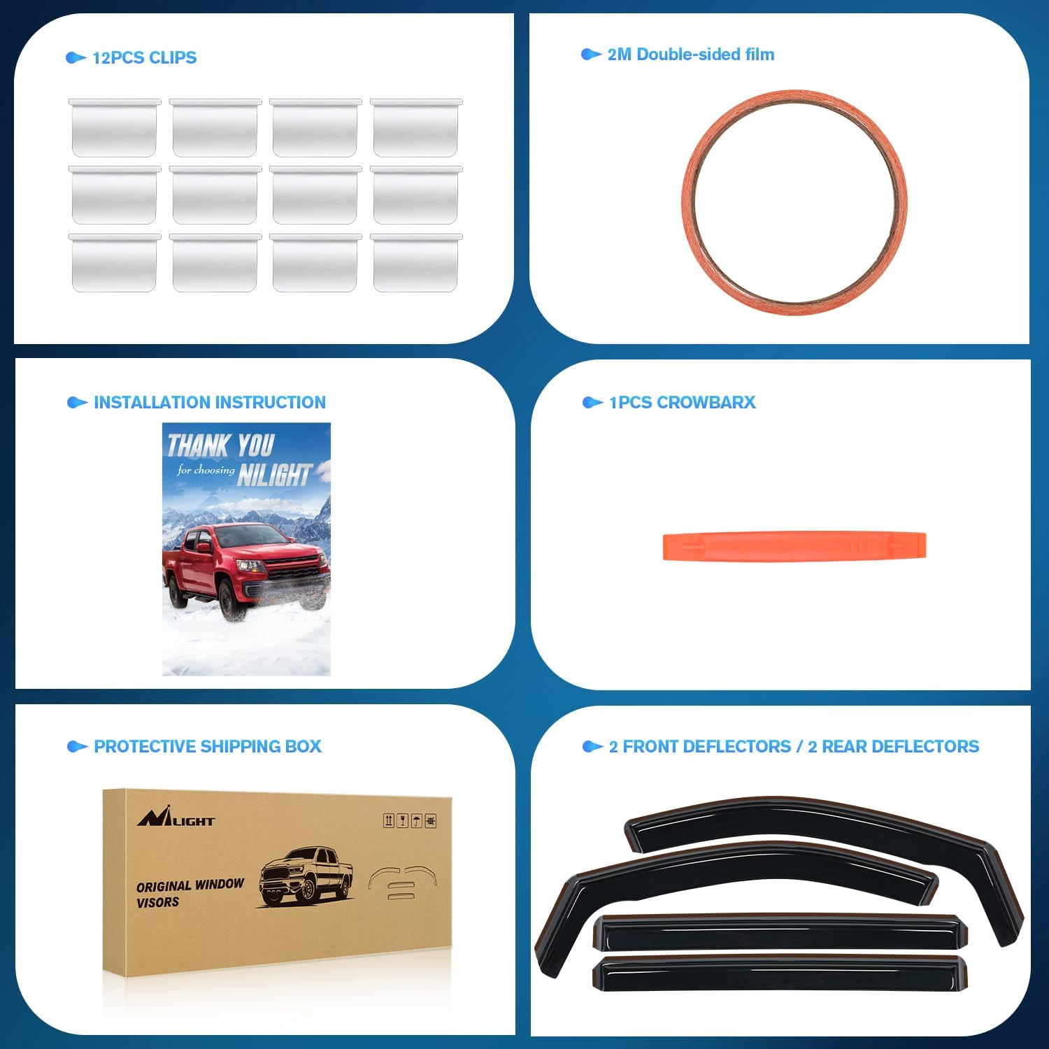 - PERFECT FIT:Window Deflectors made with tough and shatterproof premium-quality acrylic, will not easy bend, break or crack.Designed with precise engineering data to ensure custom fit to your vehicle.Reduce interior wind noise and reduce glare during night driving.