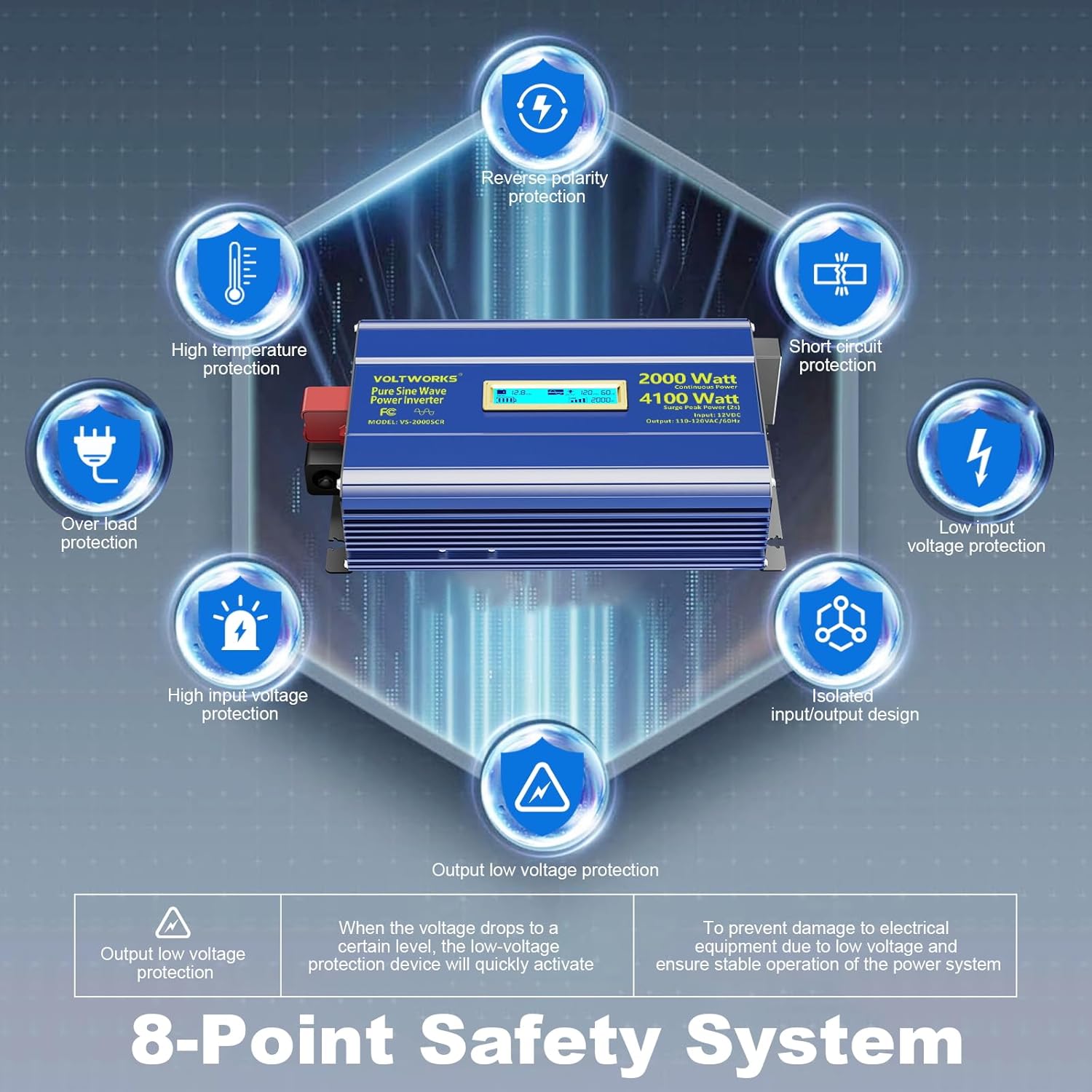 - ăUpgraded 8 Advanced Protectionsă2000 watt inverter pure sine wave including Reverse polarity protection, Input over-voltage/under-voltage protection, Output short-circuit protection, Over-load protection, Over-temperature protection, Low-input alarm. And 2025 upgraded Low-Output Voltage Protection also provide more stable voltage protection to your loads.