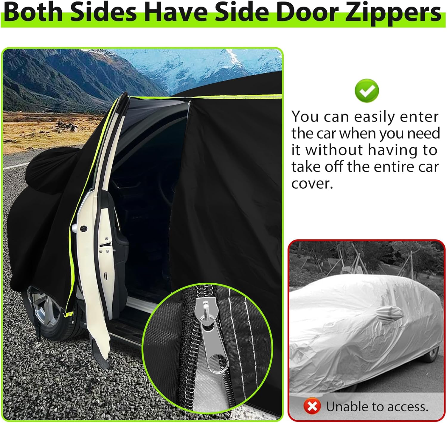 - 【Convenient Double Zipper Design】(1)The car cover has door zippers on both sides, making it convenient for us to retrieve our car contents at any time without the need to remove the cover again. (2)The entire vehicle is equipped with green reflective strips, which can allow pedestrians and vehicles to see the outline of your car in the dark at night, avoiding accidents. (3)There are straps on all four wheels to better secure the car cover and prevent it from being blown away by strong winds. (4)Provide two extra long ropes to better secure the vehicle body, making it less likely to be blown away even in typhoon weather.