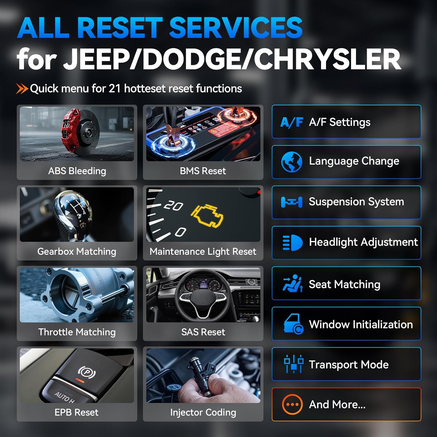 - 【IP500 OBD2 Scanner Offers 18 Services for Dodge/Jeep/chrysler】XTOOL IP500 for Jeep OBD2 scanner provides 18 special functions for Dodge/Jeep/Chrysler. For Jeep Wrangler owners can perform Suspension Calibration after lift kit installations, while for Dodge RAM drivers resolve stubborn rough idling via Throttle Matching and transmission optimizations. Its intelligent quick-access menu prioritizes 18 critical functions – EPB Reset, SAS/BMS Calibration, Headlight Adjustment, Injector Coding and more. Note:Get All Services from "Diagnose>Brand>System Selection>Special Function".Special functions vary by vehicles, please enquire us (xtoolinplusus @ outlook . c-o-m) before purchasing.
