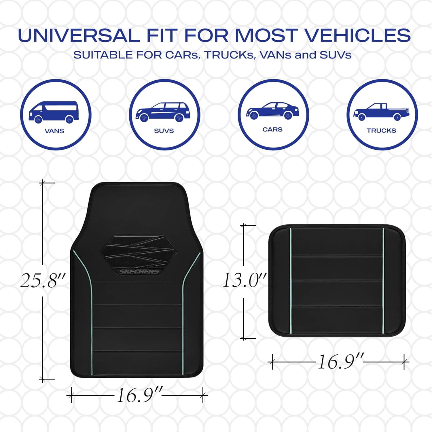 - UNIVERSAL FIT-Skechers car mats Designed to fit most SUVs,vans,sedans,and trucks, This full set includes 4 floor mats,Front piece: 25.8 Γ 16.9 inches,Back piece: 13Γ 16.9 inches, providing comprehensive coverage for both front and rear seats, giving your entire vehicle floor the protection it needs.Perfect gift for family, relatives and friends
