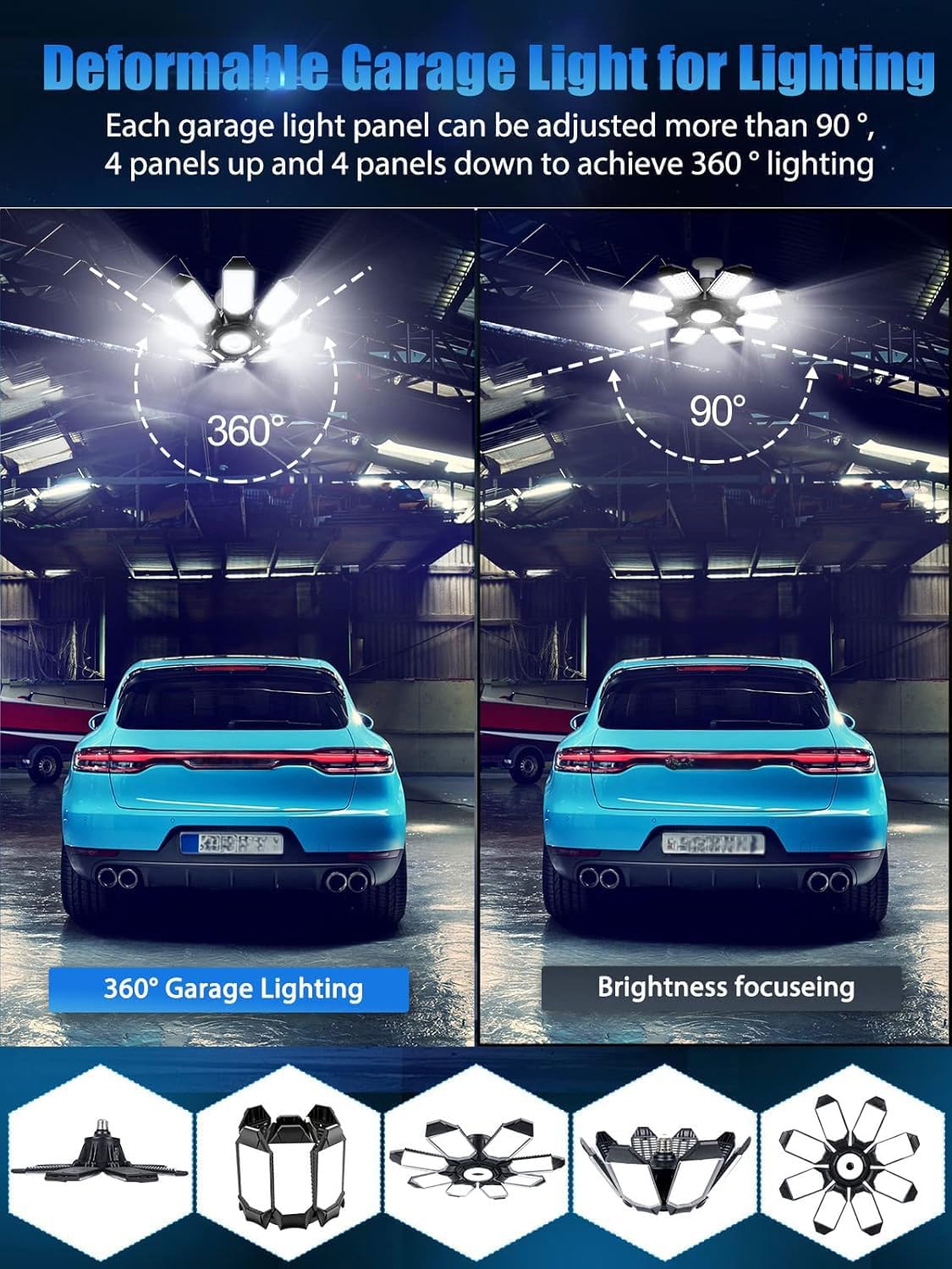 - 【8+1 Deformable Garage Lights】The garage light fixture adopts a 8+1 panel design, 8 adjustable 0-90° panels + 1 central lighting panel, which is adjustable to illuminate specific areas and achieve 360° all-round lighting coverage, garage lights to light up your life