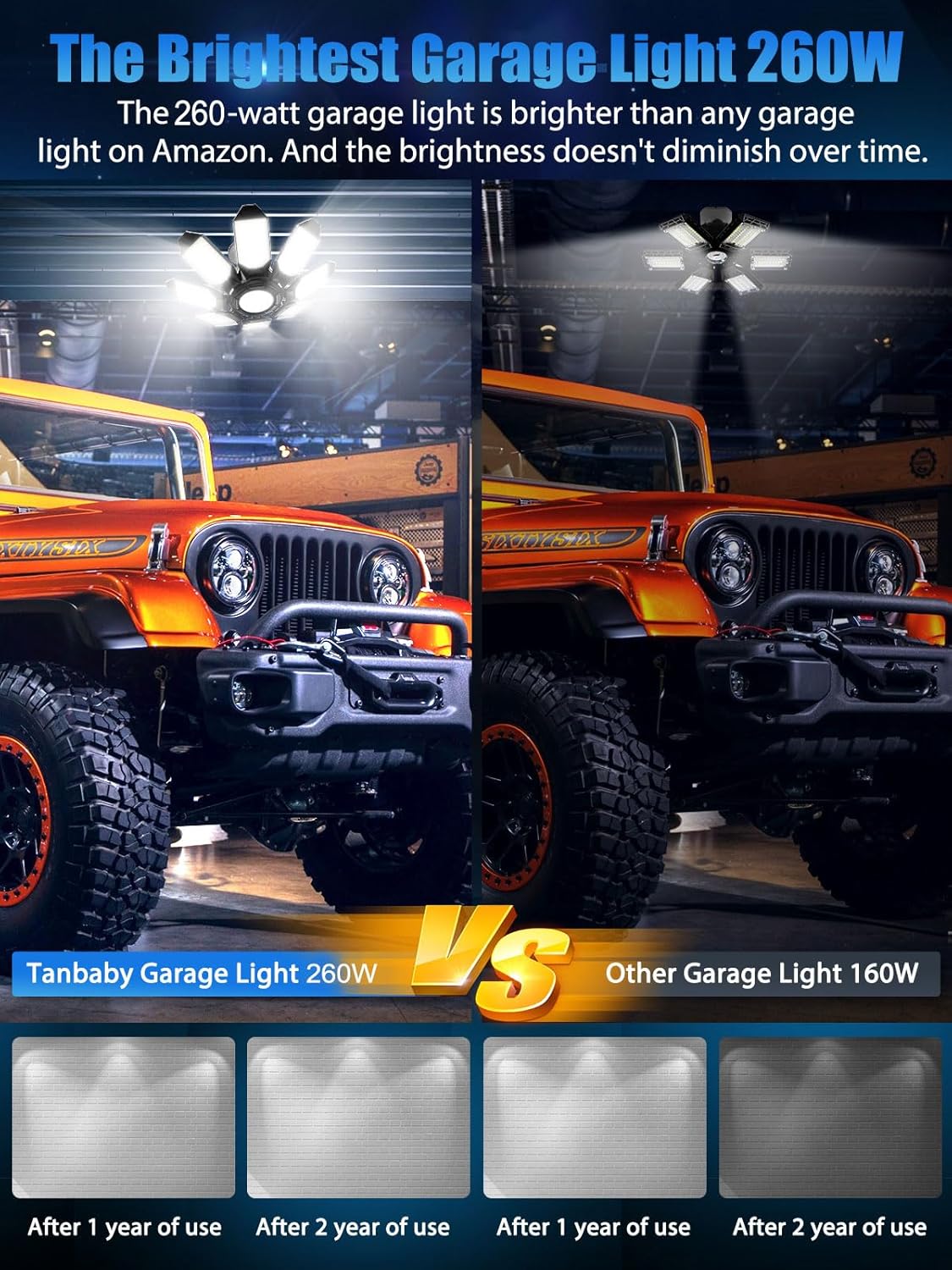 - 【LED Garage Lights 】Tanbaby garage lights use Newest technology, with 357 high-quality LED chips, two garage lights with a total light output is 52000 lumens at 65000 K "daylight" for your garage, offering no dark areas, flickering or glare, bringing you a more comfortable Visual lighting experience.Tip: This is not a motion-sensing garage light