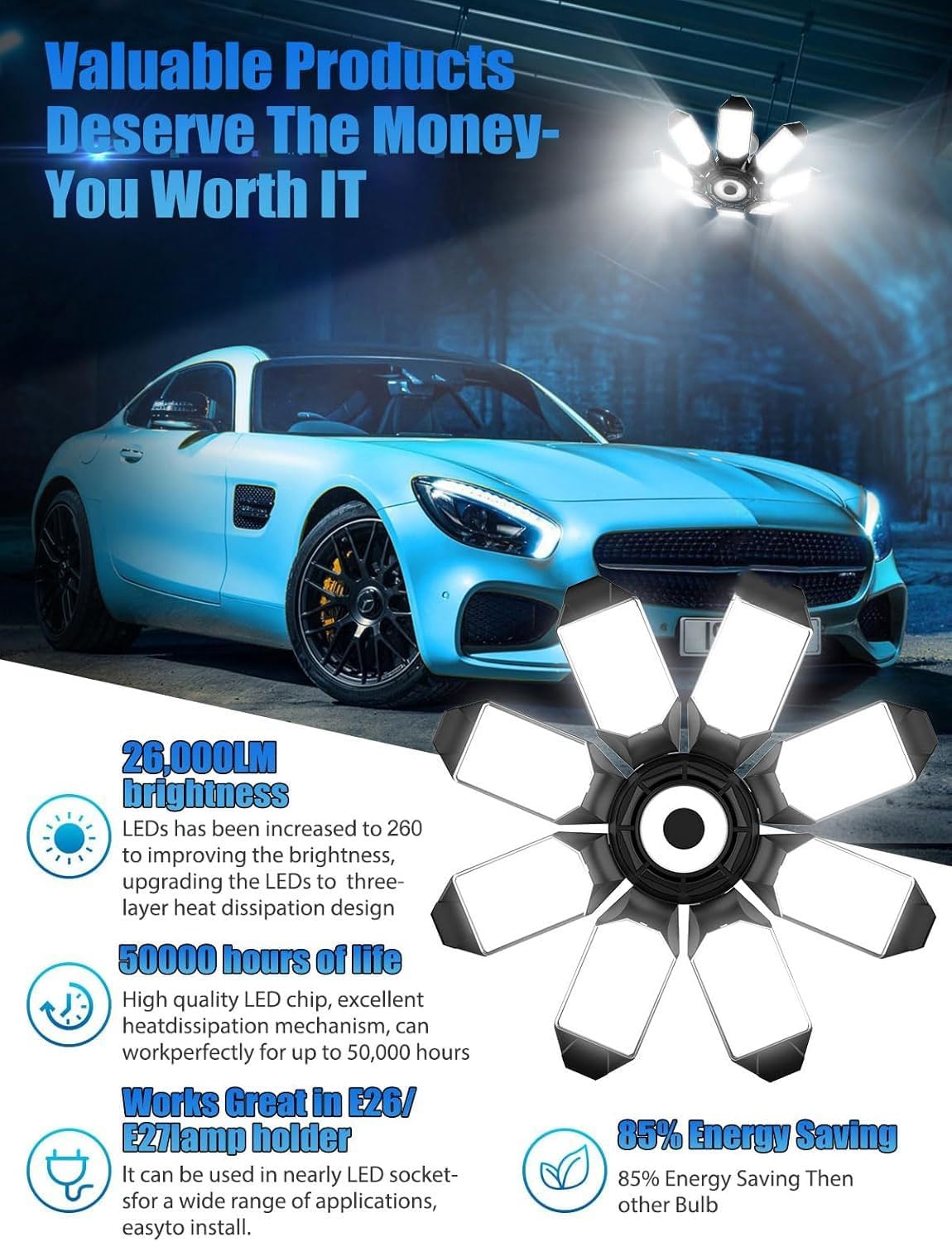 - 【Easy to Install garage led light bulb】The garage led light is suitable for the E26/E27 lamp holder, like a standard light bulb, No installation tools are required. The Tanbaby ceiling garage light is very popular in American garages, basement studios, etc