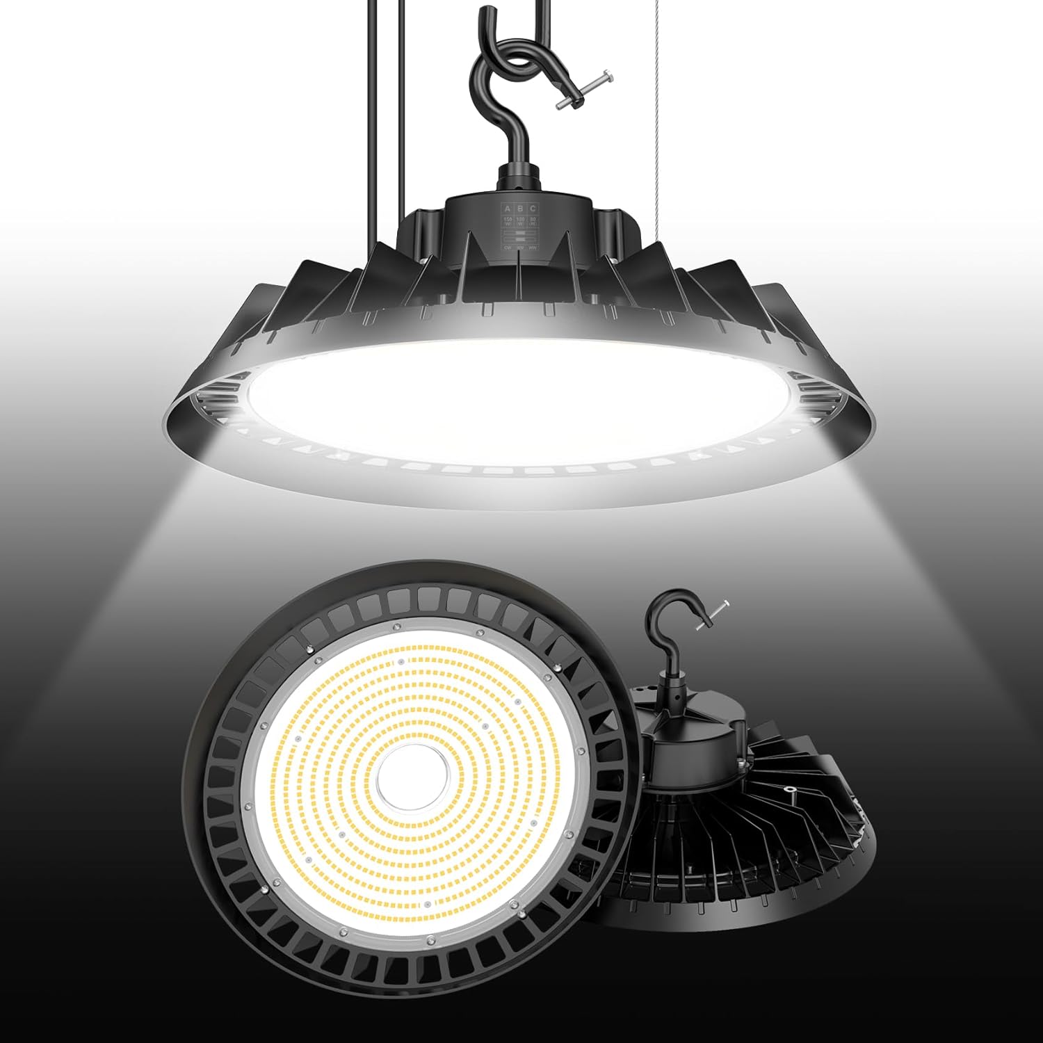- Super Waterproof & Excellent Heat Dissipation: Upgraded Led High Bay Light is made of aluminum heatsink, and excellent hollowed-out for heat dissipation high-temperature resistant and corrosion resistant, and featuring IP65 certified water resistant and dustproof, suitable for damp places or other harsh environments.Whole light has ETL and DLC Listed