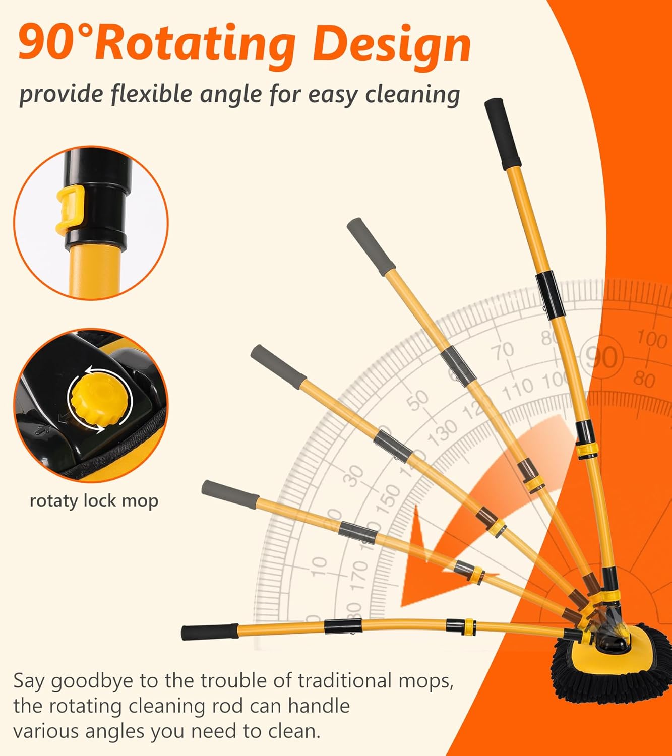 - 15° Bend and 90° Rotate Design: With the innovative design of a 15-degree bend and 90-degree rotation, our car mop allows for easy access to hard-to-reach areas and angles. No more struggling to clean those tight spaces, as our mop effortlessly glides across surfaces, ensuring a comprehensive and meticulous cleaning.