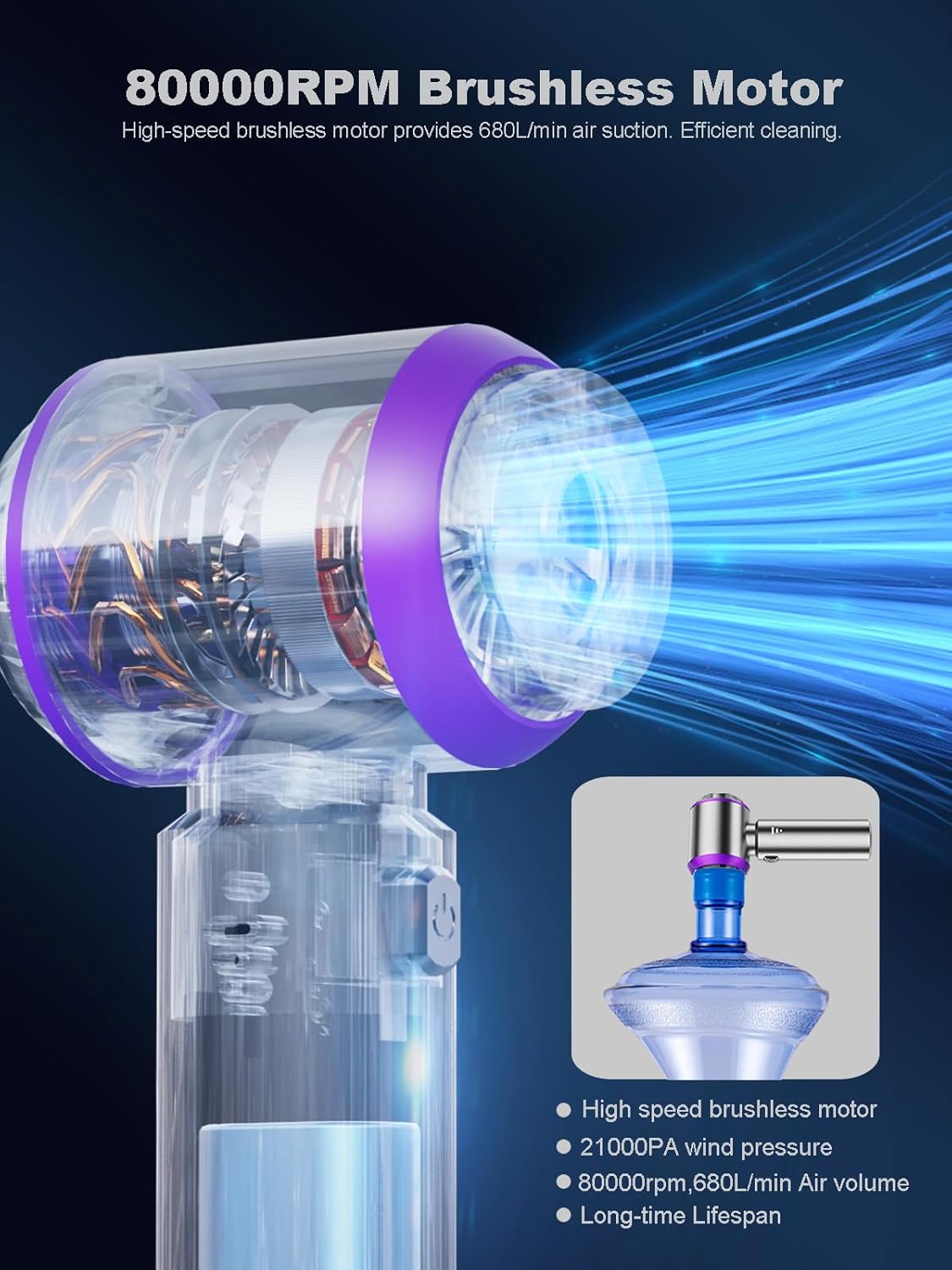 - 【Brushless Motor & 80,000RPM High Power】Vacuum/Air Duste features cutting-edge brushless motor technology, reaching up to 80,000RPM and delivering 21,000PA of suction power. Compared to traditional motors, the brushless design offers stronger suction, enhanced performance, and a longer lifespan