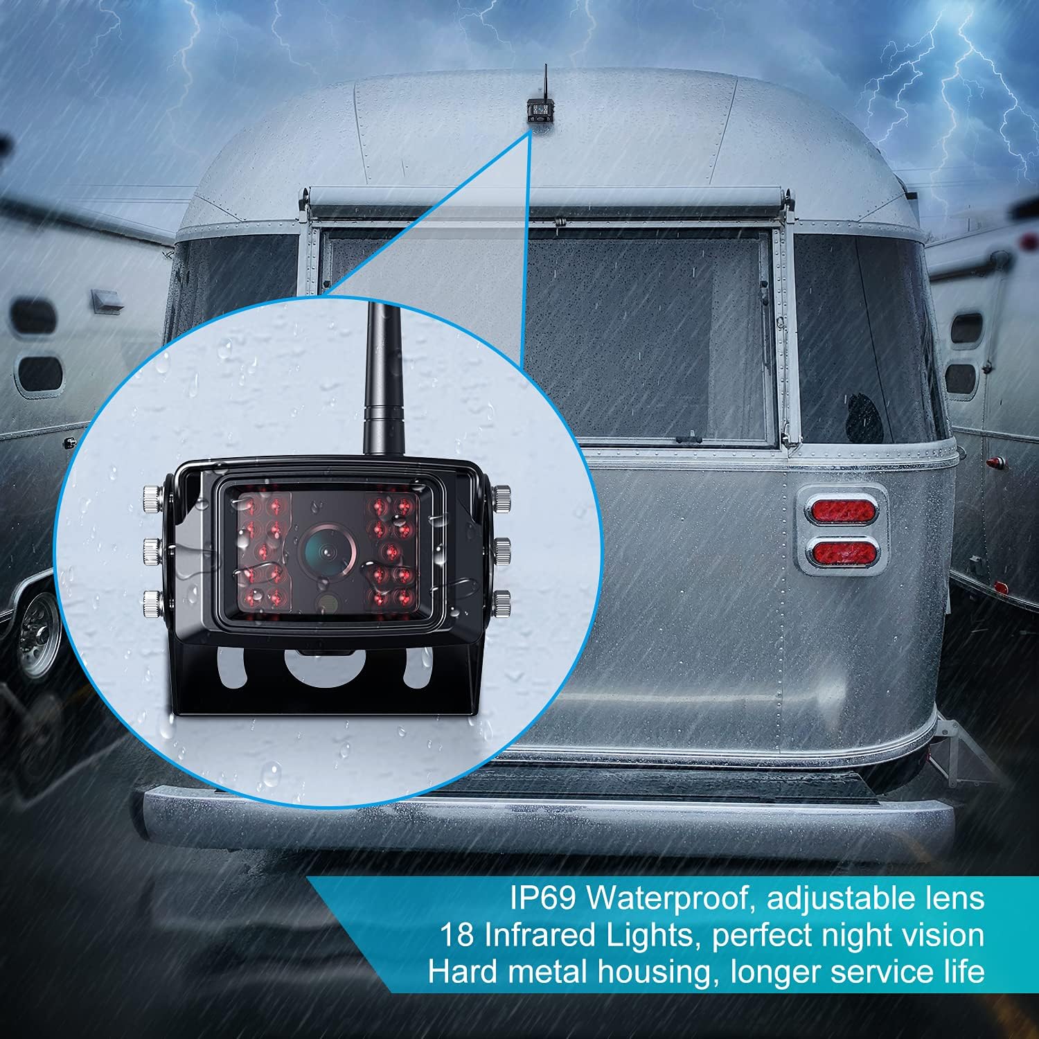 - ăWaterproof Cameras with Night VisionăThe IP69 waterproof camera works perfectly in any extreme weather. With 18 infrared lights, the camera will give you a high definition view of the night. The camera lens can be adjusted up and down, allowing you to view from different angles. The hard metal case allows the camera to be used for a longer period of time. (It can work with Furrion pre-wired RV, please ask us for the bracket adapter.)
