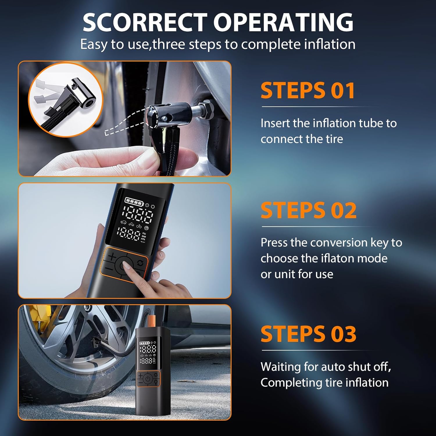 - 【180psi Tire Inflator】our digital air pump supports smart preset & auto shut-off without repeated adjustment and check. With the unique intelligent chip, which is more powerful, more stable and less noisy, the tire inflator provides fast and proper inflation to various tires, balls, etc. Friendly design with real-time data reading, detachable extended air hose and 4 optional unit switching for convenience.