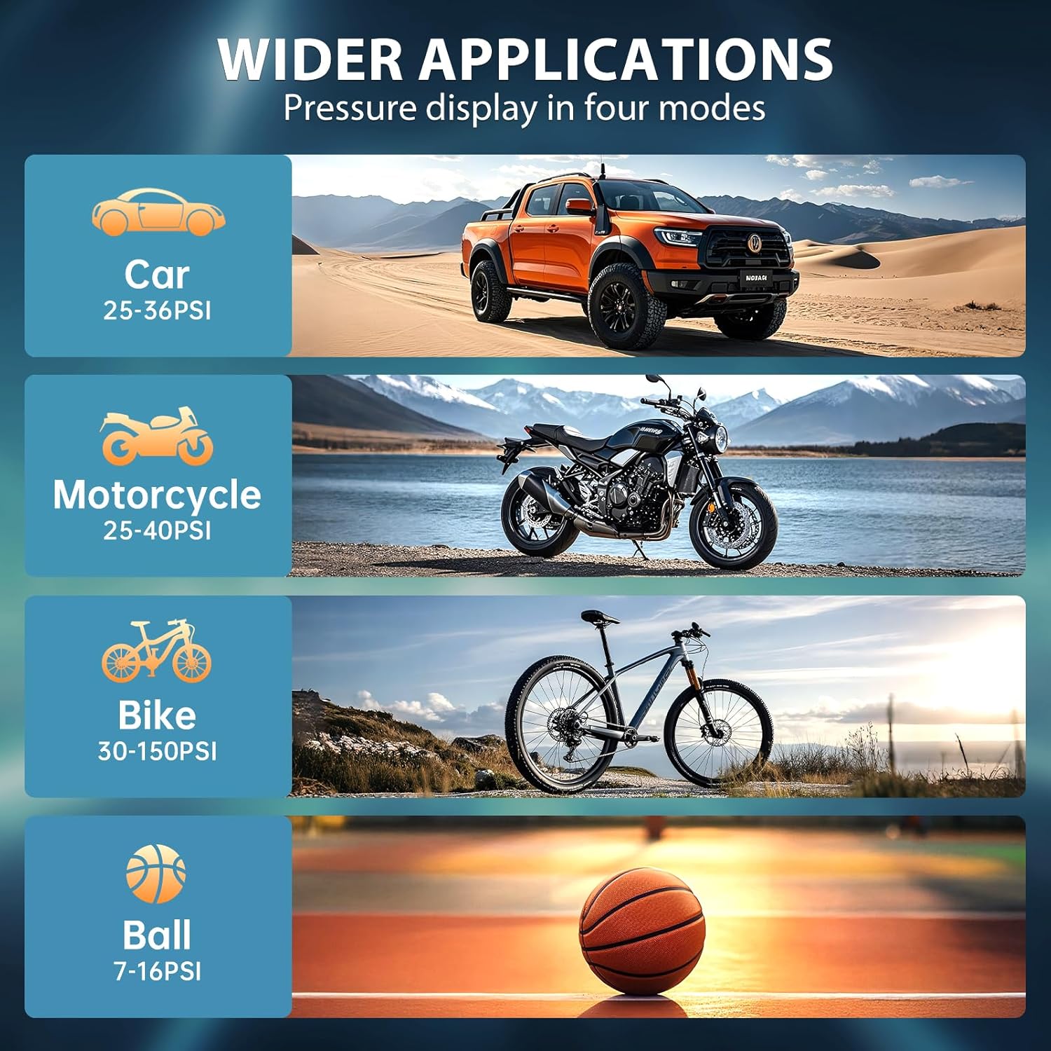 - 【4+N Smart Modes】4 preset inflation modes (bike, motorcycle, car and ball) are convenient for beginners to choose. The manual mode can also set the pressure value (3-180psi) according to the inflation object to meet various inflation requirements. It is an ideal choice for inflating cars, motorcycles, bicycle tires