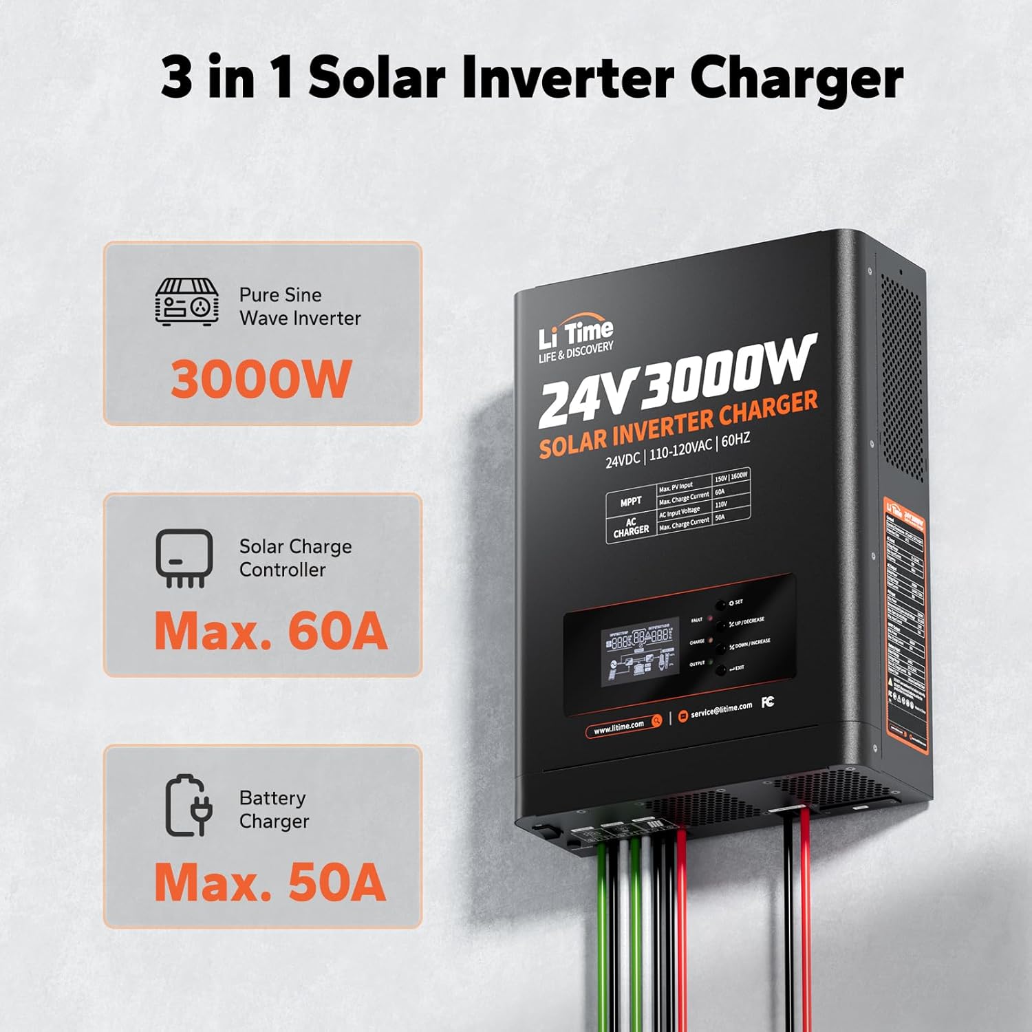 - High-Performance Solar Inverter Charger: The LiTime 24V 3000W All-in-One Solar Inverter Charger is the ultimate solution for Home Energy Storage and Off-Grid Solar Systems, integrating an MPPT Solar Controller, inverter, and charger in one unit(Supporting 9000W surge). Achieve auto photovoltaic tracking and pure sine wave output, ensuring stable and efficient energy conversion and usage. This product is ideal for Home Energy Storage, and Off-Grid applications.