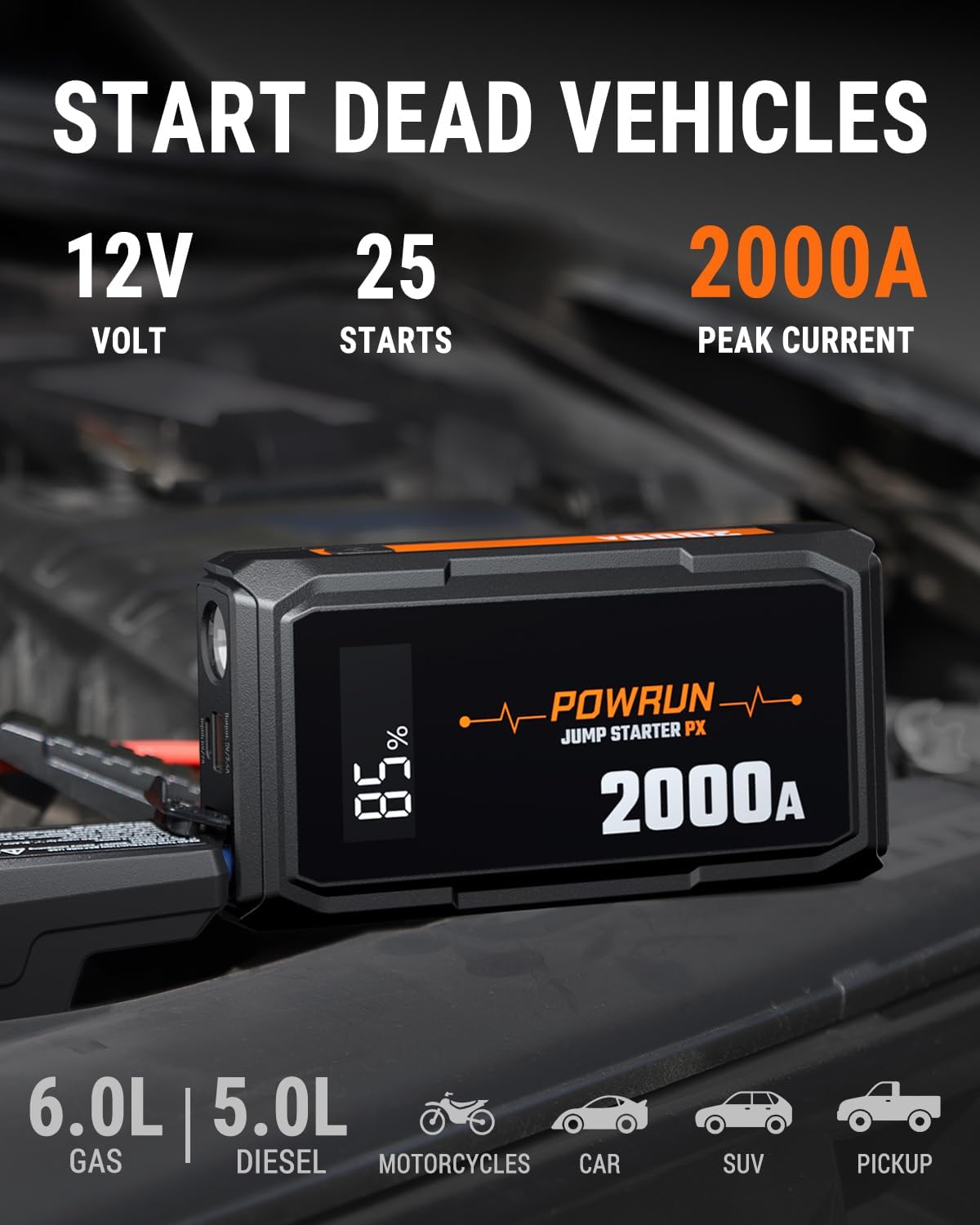 Powrun P-X Jump Starter, 2000A Portable Jump Box - Car Jump Starter Battery Pack for up to 6.0L Gas and 5.0L Diesel Engines, 12V Battery Jump Starter with Carry Bag