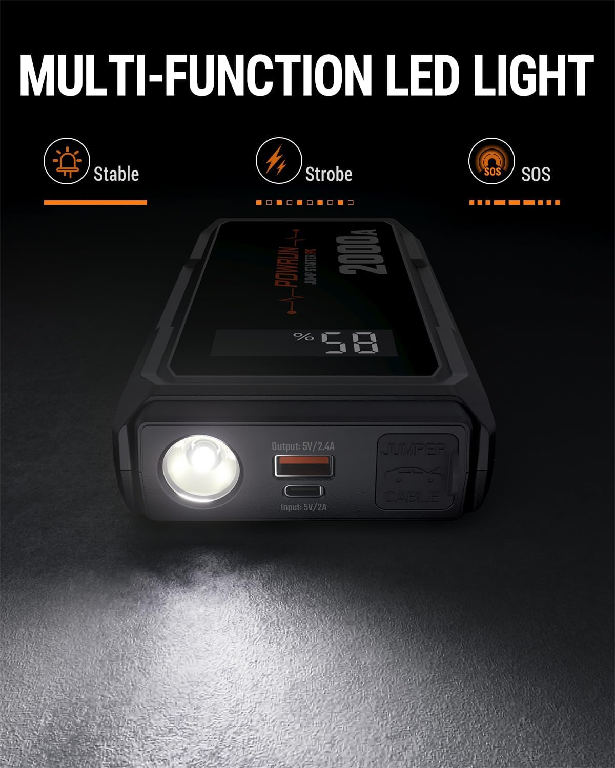 - HUMANIZATION DESIGN - Powrun battery jump box is equipped with a digital LCD screen to show the battery status. Compared with other devices without LCD screens but only indicators, you can view the battery status and remaining power more visually. The rubber-covered molded case is waterproof, dust-proof, and shatter-proof which is durable enough for outdoor use. The device is always ready to work.