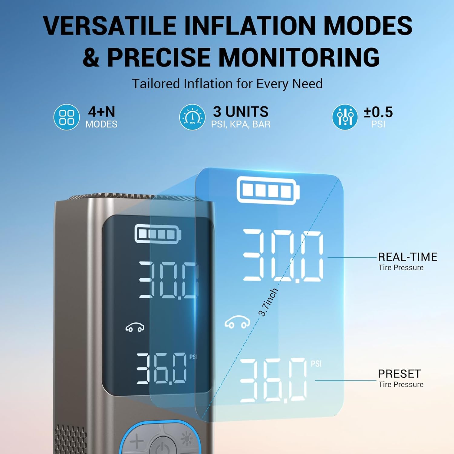 - Versatile Portable Inflator Air Pump & Precise Monitoring: Could be bike tire pump, electric air pump for balls, travel air pump and more, the AP18 tire pump with digital pressure gauge lets you easily switch between PSI, BAR, and KPA. The 3.7 inch dual LCD screen provides accurate readings down to ±0.5 PSI, offering precise monitoring of your tire pressure.