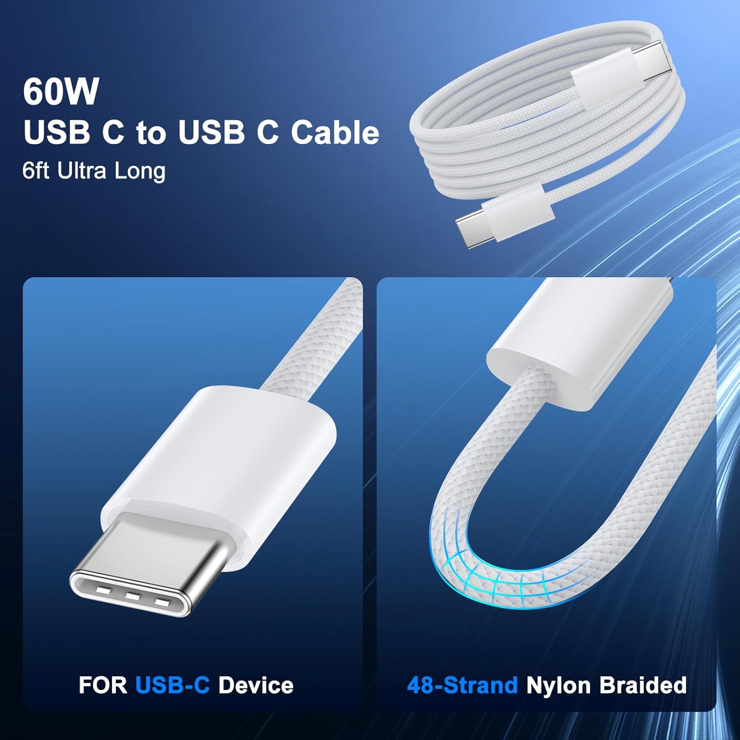 - Cable Works for iPhone 16: Package comes with 1 X 6ft USB C to C cable, which is compatible with iPhone 16 and iPhone 15 series. Compared with normal PVC/TPE material USB C cables, ours is covered by 48 strand nylon, make it stronger and tangle-free. Even though youâre sitting at the back seat you could still enjoy fast charging.